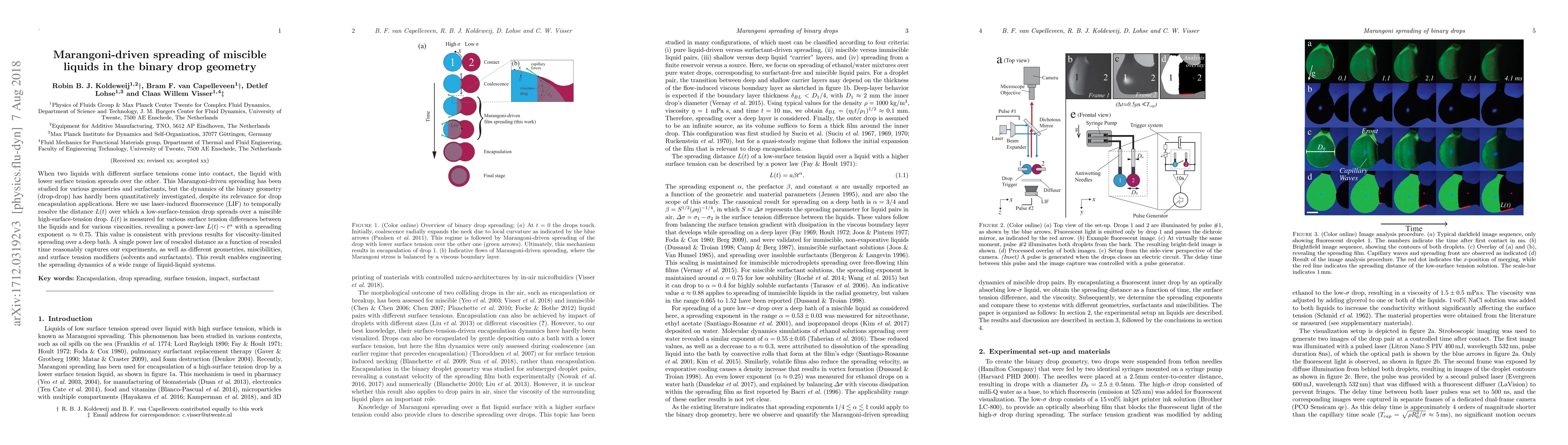 This study investigates the Marangoni-driven spreading of miscible liquids in a binary drop geometry using laser-induced fluorescence, revealing a power-law relationship $L(t) \sim t^{0.75}$ for the spreading distance over time. The findings provide a unified model for predicting spreading dynamics across various liquid systems.