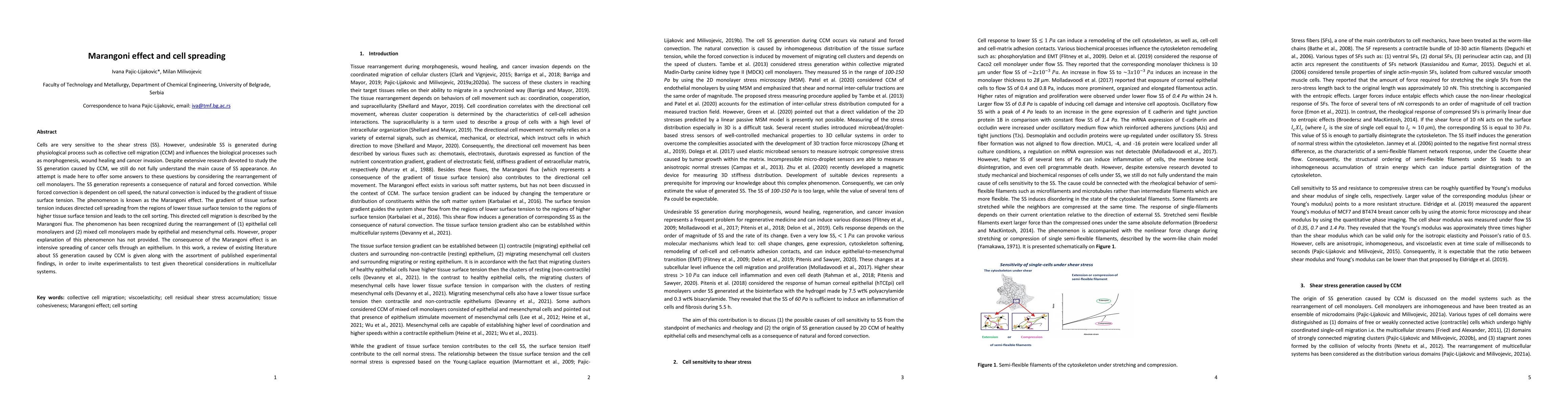 Cells are very sensitive to the shear stress (SS). However, undesirable SS is generated during physiological process such as collective cell migration (CCM) and influences the biological processes such as morphogenesis, wound healing and cancer invasion. Despite extensive research devoted to study the stress generation caused by CCM, we still do not fully understand the main cause of SS generation. An attempt is made here to offer some answers to these questions by considering the rearrangement of cell monolayers. The SS generation represents a consequence of natural and forced convection. While forced convection is dependent on cell speed, the natural convection is induced by the gradient of tissue surface tension. The phenomenon is known as the Marangoni effect. The gradient of tissue surface tension induces directed cell spreading from the regions of lower tissue surface tension to the regions of higher tissue surface tension. This directed cell migration is described by the Marangoni flux. The phenomenon has been recognized during the rearrangement of (1) epithelial cell monolayers and (2) mixed cell monolayers made by epithelial and mesenchymal cells. The consequence of the Marangoni effect is an intensive spreading of cancer cells through an epithelium. In this work, a review of existing literature about SS generation caused by CCM is given along with the assortment of published experimental findings, in order to invite experimentalists to test given theoretical considerations in multicellular systems.
