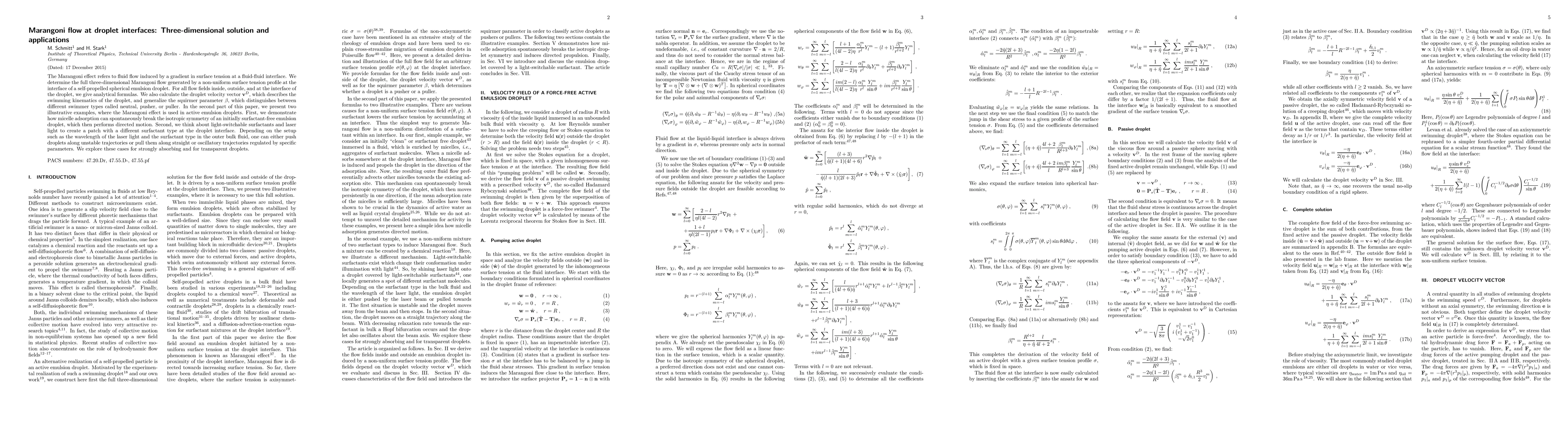 This paper provides analytical solutions for three-dimensional Marangoni flow at the interface of a self-propelled spherical emulsion droplet, detailing the flow fields and droplet velocity. It also explores applications, including the spontaneous directed motion of droplets due to micelle adsorption and the control of droplet motion using light-switchable surfactants and laser light.