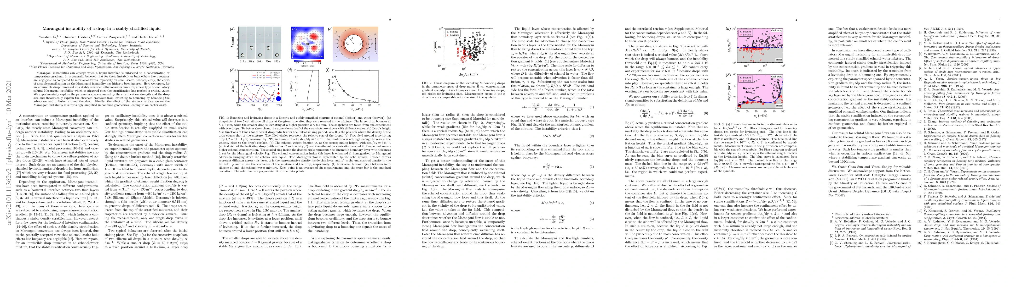 This paper explores how stable stratification affects Marangoni instabilities in an immiscible drop in a stratified liquid, revealing a new oscillatory instability triggered by critical stratification levels. The study combines experimental observations and theoretical analysis to explain the transition from levitating to bouncing drops and notes the amplified instability in confined geometries.