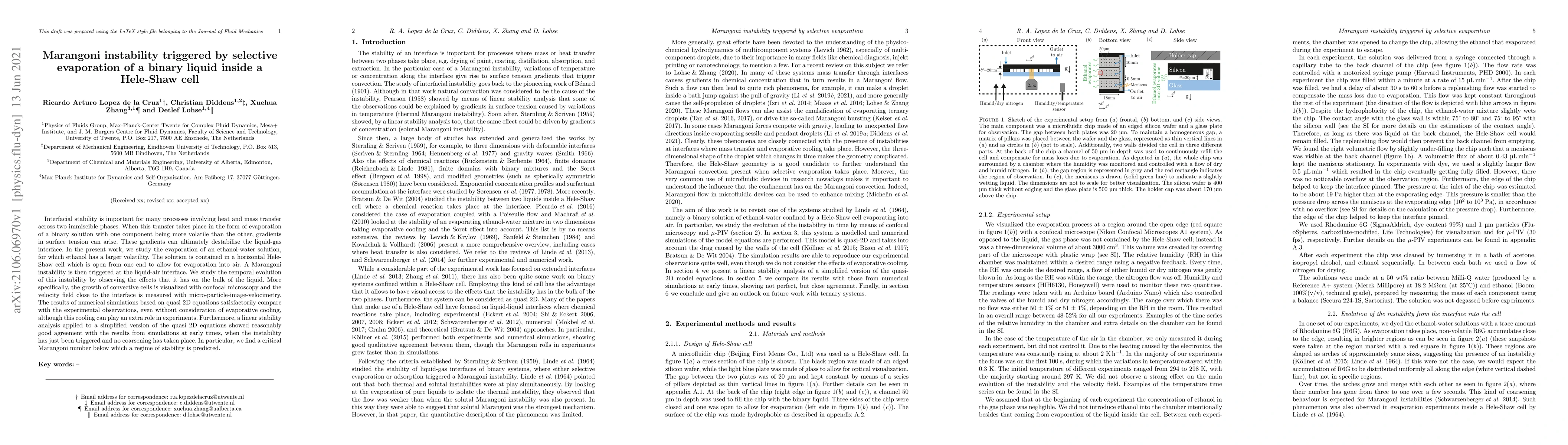 This study investigates Marangoni instability caused by selective evaporation of a binary ethanol-water solution in a Hele-Shaw cell, visualizing convective cell growth and measuring velocity fields. Numerical simulations and linear stability analysis show good agreement with experimental observations, identifying a critical Marangoni number for stability.