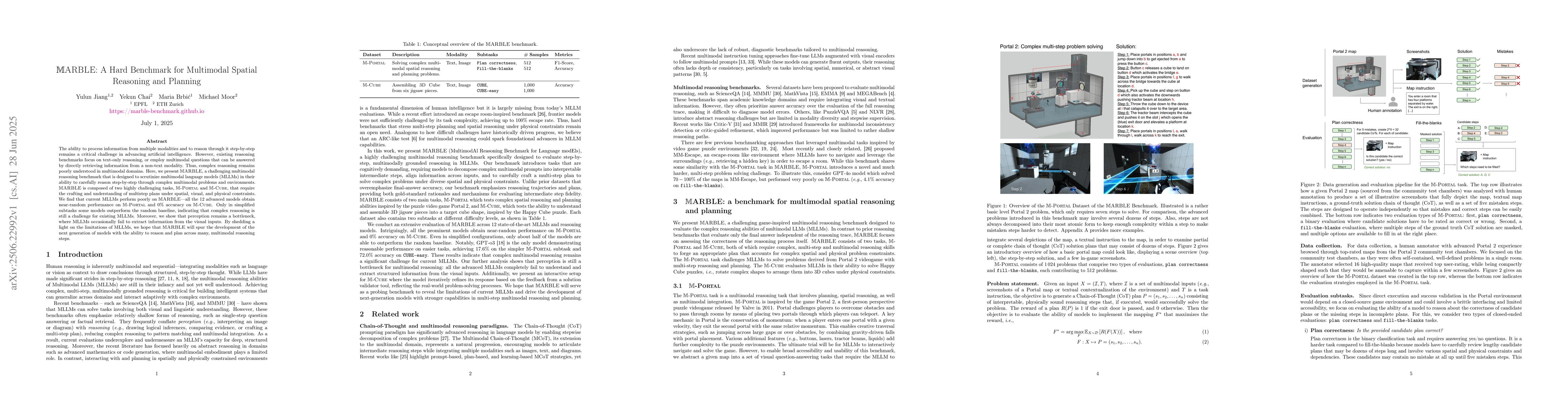 The ability to process information from multiple modalities and to reason through it step-by-step remains a critical challenge in advancing artificial intelligence. However, existing reasoning benchmarks focus on text-only reasoning, or employ multimodal questions that can be answered by directly retrieving information from a non-text modality. Thus, complex reasoning remains poorly understood in multimodal domains. Here, we present MARBLE, a challenging multimodal reasoning benchmark that is designed to scrutinize multimodal language models (MLLMs) in their ability to carefully reason step-by-step through complex multimodal problems and environments. MARBLE is composed of two highly challenging tasks, M-Portal and M-Cube, that require the crafting and understanding of multistep plans under spatial, visual, and physical constraints. We find that current MLLMs perform poorly on MARBLE -- all the 12 advanced models obtain near-random performance on M-Portal and 0% accuracy on M-Cube. Only in simplified subtasks some models outperform the random baseline, indicating that complex reasoning is still a challenge for existing MLLMs. Moreover, we show that perception remains a bottleneck, where MLLMs occasionally fail to extract information from the visual inputs. By shedding a light on the limitations of MLLMs, we hope that MARBLE will spur the development of the next generation of models with the ability to reason and plan across many, multimodal reasoning steps.