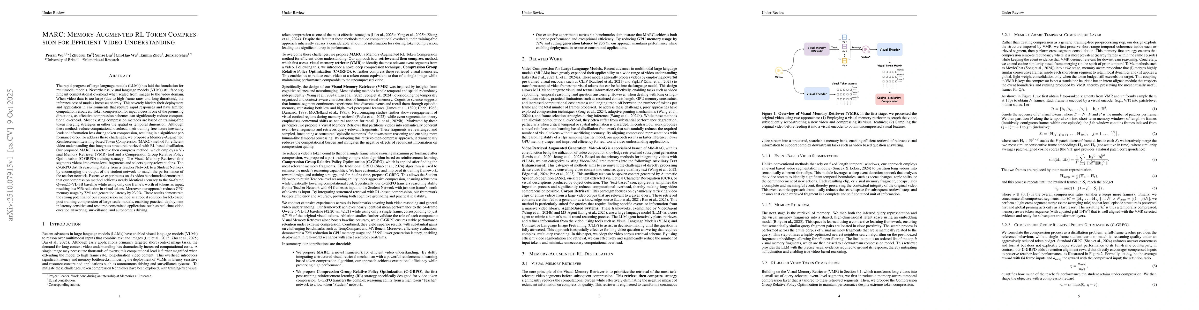 The rapid progress of large language models (LLMs) has laid the foundation for multimodal models. However, visual language models (VLMs) still face heavy computational costs when extended from images to videos due to high frame rates and long durations. Token compression is a promising solution, yet most existing training-free methods cause information loss and performance degradation. To overcome this, we propose \textbf{Memory-Augmented Reinforcement Learning-based Token Compression (MARC)}, which integrates structured retrieval and RL-based distillation. MARC adopts a \textit{retrieve-then-compress} strategy using a \textbf{Visual Memory Retriever (VMR)} to select key clips and a \textbf{Compression Group Relative Policy Optimization (C-GRPO)} framework to distil reasoning ability from a teacher to a student model. Experiments on six video benchmarks show that MARC achieves near-baseline accuracy using only one frame's tokens -- reducing visual tokens by \textbf{95\%}, GPU memory by \textbf{72\%}, and latency by \textbf{23.9\%}. This demonstrates its potential for efficient, real-time video understanding in resource-constrained settings such as video QA, surveillance, and autonomous driving.