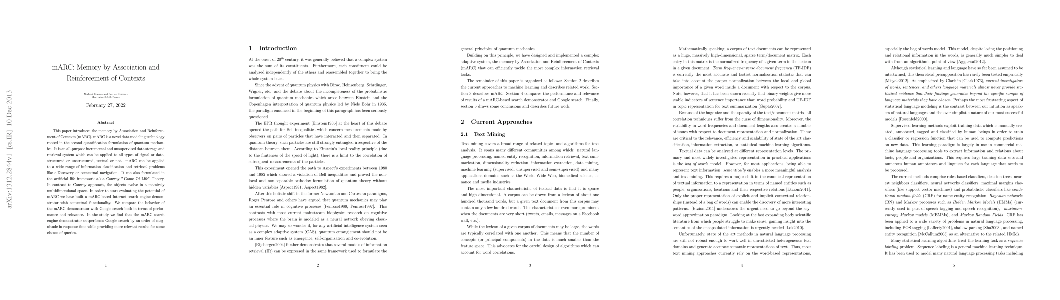 This paper introduces the memory by Association and Reinforcement of Contexts (mARC). mARC is a novel data modeling technology rooted in the second quantization formulation of quantum mechanics. It is an all-purpose incremental and unsupervised data storage and retrieval system which can be applied to all types of signal or data, structured or unstructured, textual or not. mARC can be applied to a wide range of information clas-sification and retrieval problems like e-Discovery or contextual navigation. It can also for-mulated in the artificial life framework a.k.a Conway "Game Of Life" Theory. In contrast to Conway approach, the objects evolve in a massively multidimensional space. In order to start evaluating the potential of mARC we have built a mARC-based Internet search en-gine demonstrator with contextual functionality. We compare the behavior of the mARC demonstrator with Google search both in terms of performance and relevance. In the study we find that the mARC search engine demonstrator outperforms Google search by an order of magnitude in response time while providing more relevant results for some classes of queries.