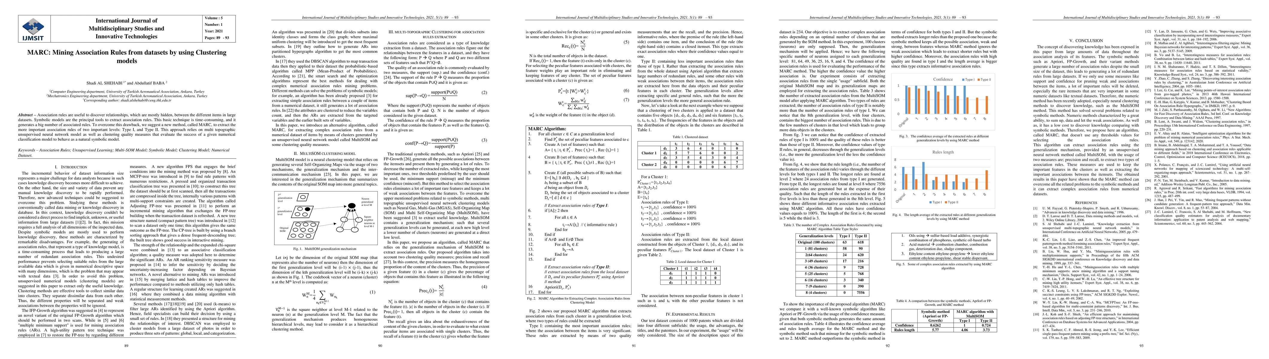 Association rules are useful to discover relationships, which are mostly hidden, between the different items in large datasets. Symbolic models are the principal tools to extract association rules. This basic technique is time-consuming, and it generates a big number of associated rules. To overcome this drawback, we suggest a new method, called MARC, to extract the more important association rules of two important levels: Type I, and Type II. This approach relies on a multi-topographic unsupervised neural network model as well as clustering quality measures that evaluate the success of a given numerical classification model to behave as a natural symbolic model.