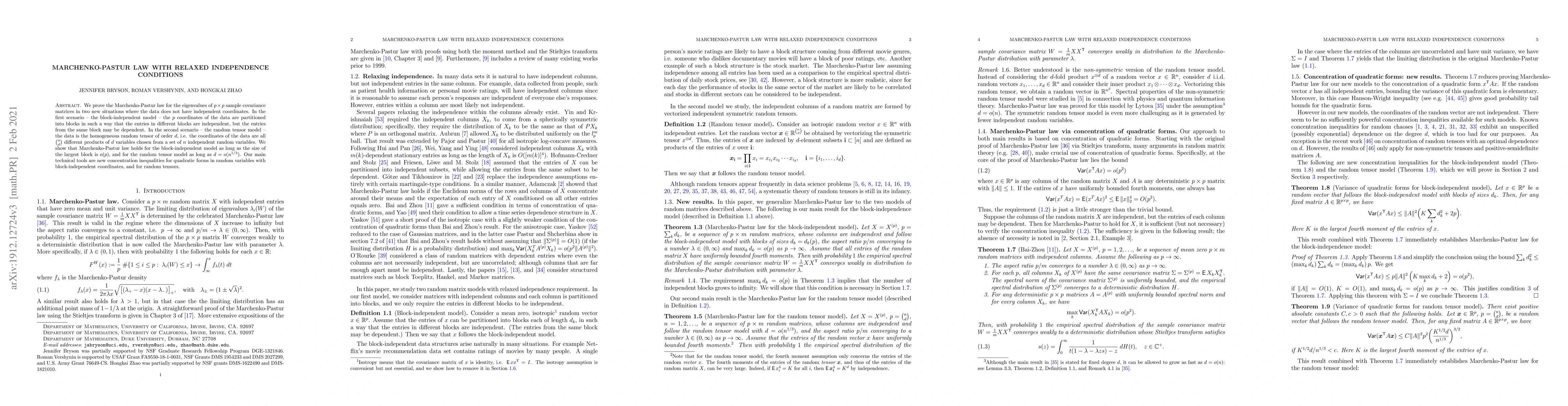 This paper proves the Marchenko-Pastur law for eigenvalues of sample covariance matrices under relaxed independence conditions, showing applicability in block-independent and random tensor models, provided the size of the largest block and the tensor order meet specific constraints. The study employs new concentration inequalities tailored to these models.