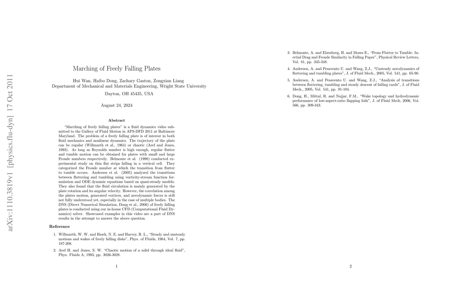 This work builds upon previous research by Willmarth et al. (1964), Aref and Jones (1993), Belmonte et al. (1998), and Andersen et al. (2005) by employing DNS to further analyze the transitions between flutter and tumble motions, offering new DNS results that contribute to understanding the complex interactions in falling plates' motion.