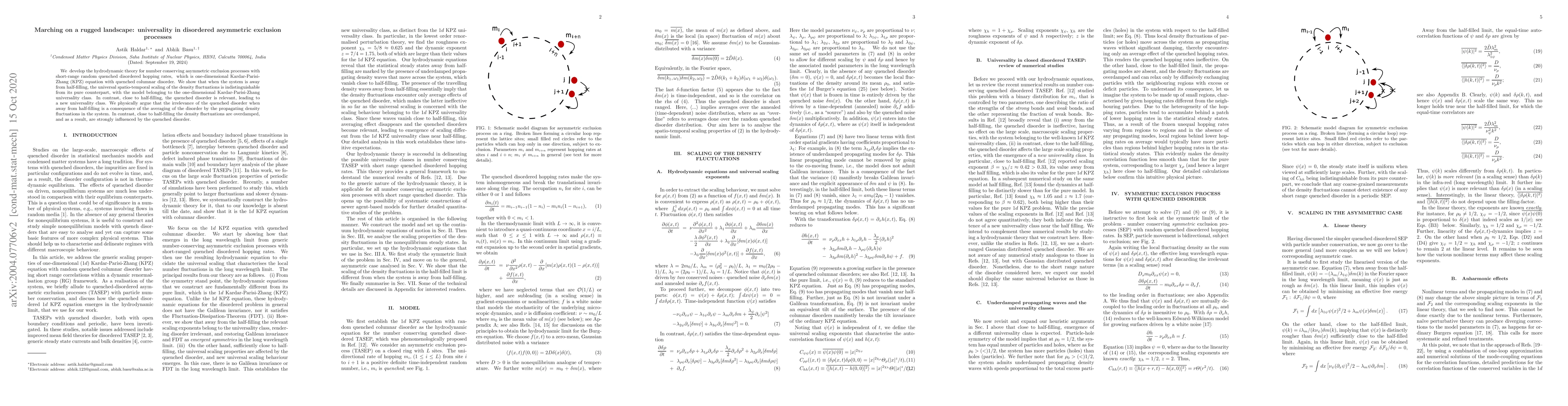 We develop the hydrodynamic theory for number conserving asymmetric exclusion processes with short-range random quenched disordered hopping rates, which is one-dimensional Kardar-Parisi- Zhang (KPZ) equation with quenched columnar disorder. We show that when the system is away from half-filling, the universal spatio-temporal scaling of the density fluctuations is indistinguishable from its pure counterpart, with the model belonging to the one-dimensional Kardar-Parisi-Zhang universality class. In contrast, close to half-filling, the quenched disorder is relevant, leading to a new universality class. We physically argue that the irrelevance of the quenched disorder when away from half-filling is a consequence of the averaging of the disorder by the propagating density fluctuations in the system. In contrast, close to half-filling the density fluctuations are overdamped, and as a result, are strongly influenced by the quenched disorder.