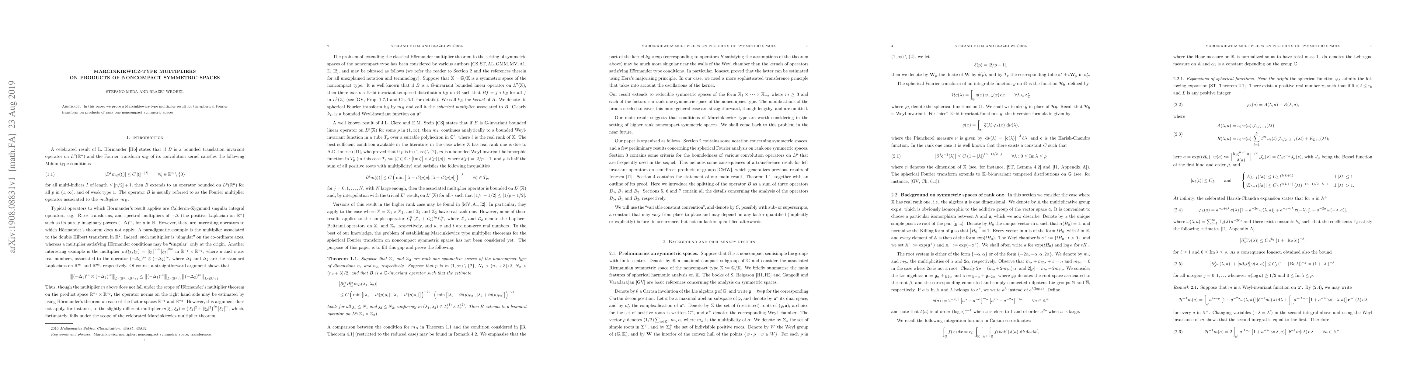 Summary: This research establishes a Marcinkiewicz-type multiplier theorem for the spherical Fourier transform on products of rank one noncompact symmetric spaces, extending the classical results to more complex geometric settings.