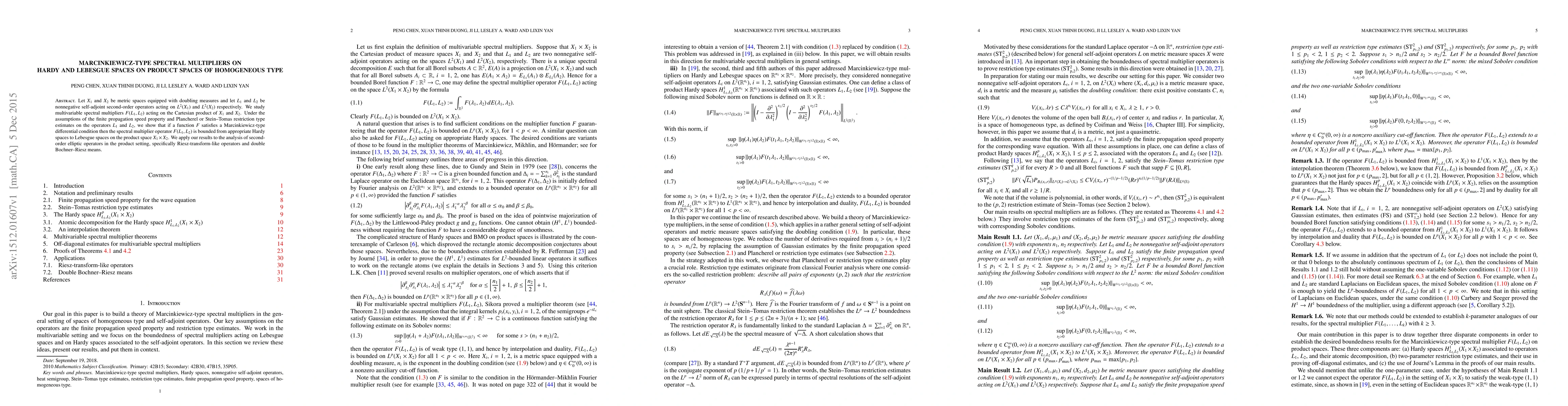 This paper investigates multivariable spectral multipliers $F(L_1, L_2)$ on product spaces of homogeneous type, showing boundedness from Hardy to Lebesgue spaces under Marcinkiewicz-type conditions. Applications include analysis of elliptic operators, Riesz transforms, and double Bochner-Riesz means.