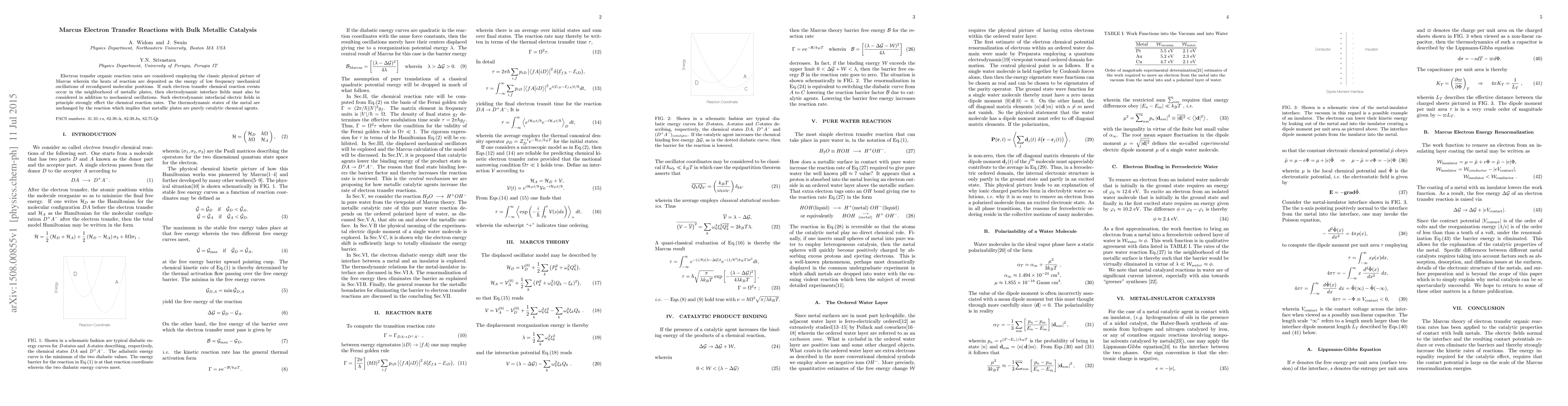 Electron transfer organic reaction rates are considered employing the classic physical picture of Marcus wherein the heats of reaction are deposited as the energy of low frequency mechanical oscillations of reconfigured molecular positions. If such electron transfer chemical reaction events occur in the neighborhood of metallic plates, then electrodynamic interface fields must also be considered in addition to mechanical oscillations. Such electrodynamic interfacial electric fields in principle strongly effect the chemical reaction rates. The thermodynamic states of the metal are unchanged by the reaction which implies that metallic plates are purely catalytic chemical agents.