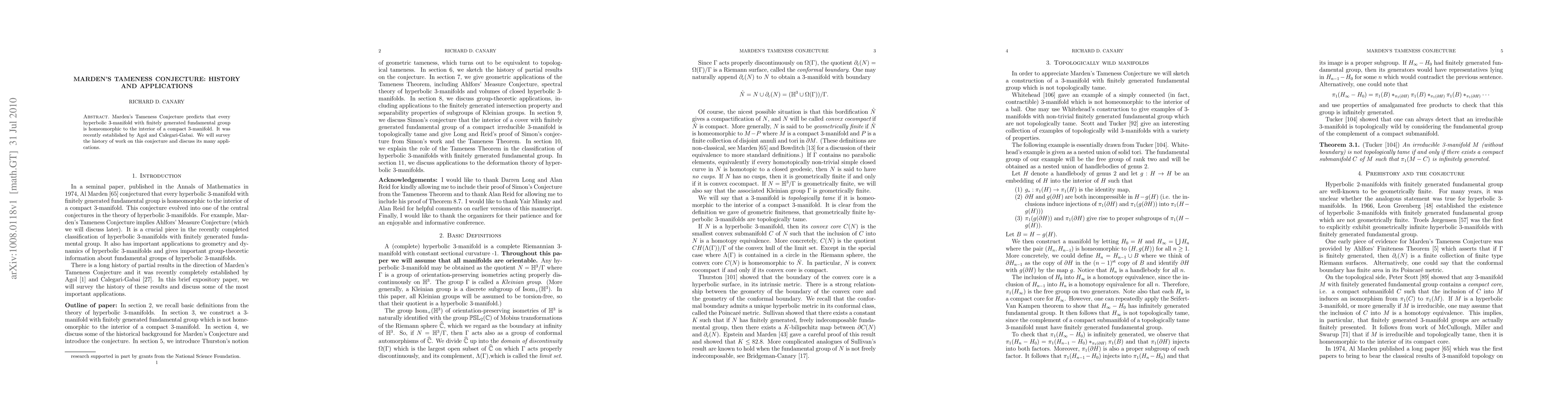 Marden's Tameness Conjecture predicts that every hyperbolic 3-manifold with finitely generated fundamental group is homeomorphic to the interior of a compact 3-manifold. It was recently established by Agol and Calegari-Gabai. We will survey the history of work on this conjecture and discuss its many applications.