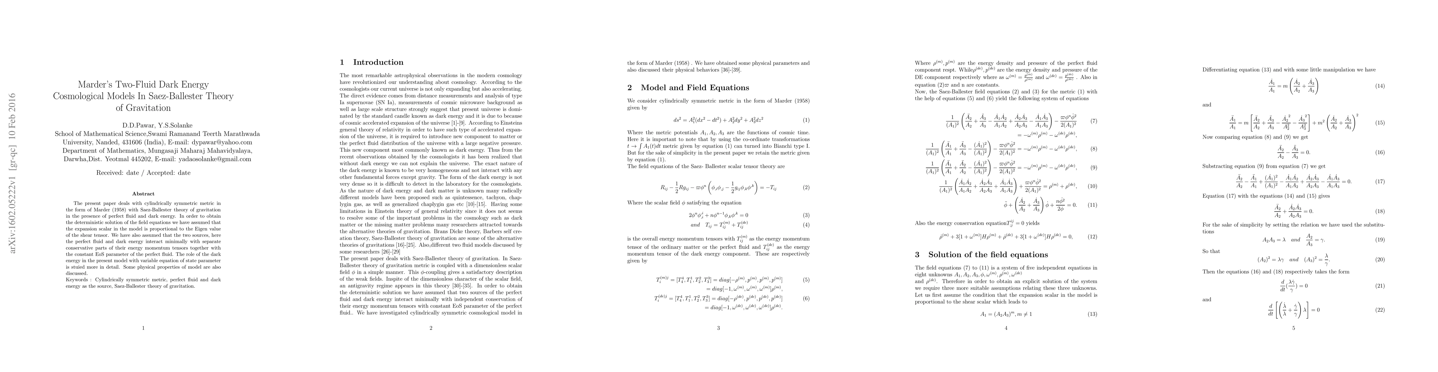 The present paper deals with cylindrically symmetric metric in the form of Marder (1958) with Saez-Ballester theory of gravitation in the presence of perfect fluid and dark energy. In order to obtain the deterministic solution of the field equations we have assumed that the expansion scalar in the model is proportional to the Eigen value of the shear tensor. We have also assumed that the two sources, here the perfect fluid and dark energy interact minimally with separate conservative parts of their energy momentum tensors together with the constant EoS parameter of the perfect fluid. The role of the dark energy in the present model with variable equation of state parameter is studied more in detail. Some physical properties of model are also discussed.