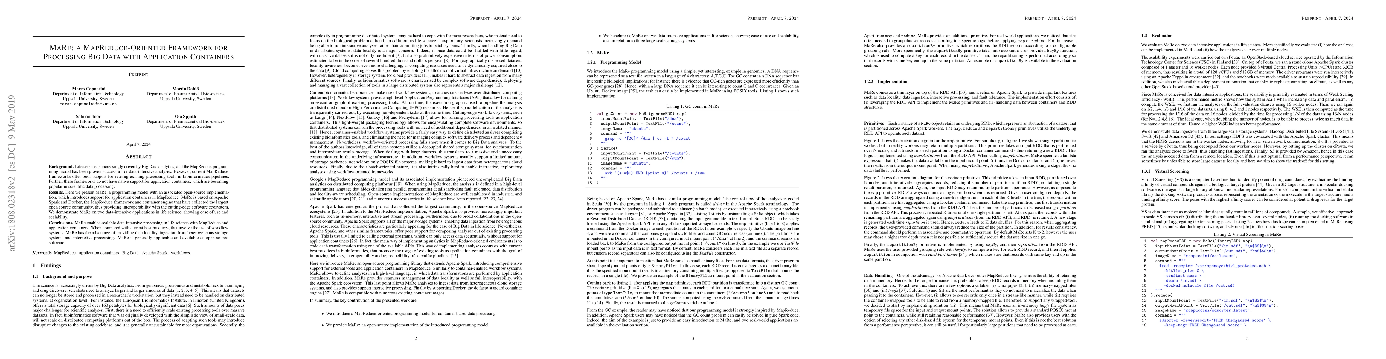MaRe is a MapReduce-oriented framework integrating application containers for scalable big data processing in life sciences, leveraging Apache Spark and Docker for enhanced interoperability and usability. It offers data locality and interactive processing, surpassing traditional workflow systems.