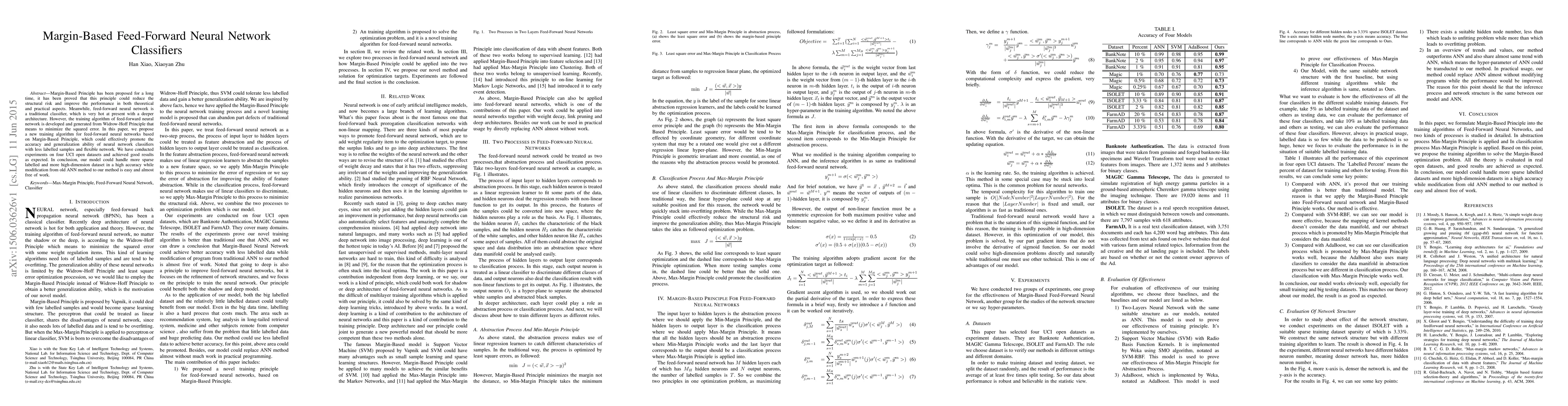 This paper proposes a new training algorithm for feed-forward neural networks based on the Margin-Based Principle to enhance accuracy and generalization, especially with fewer labeled samples. Experiments on four UCI datasets show promising results, indicating the model's effectiveness for high-dimensional data with minimal changes to existing neural network methods.