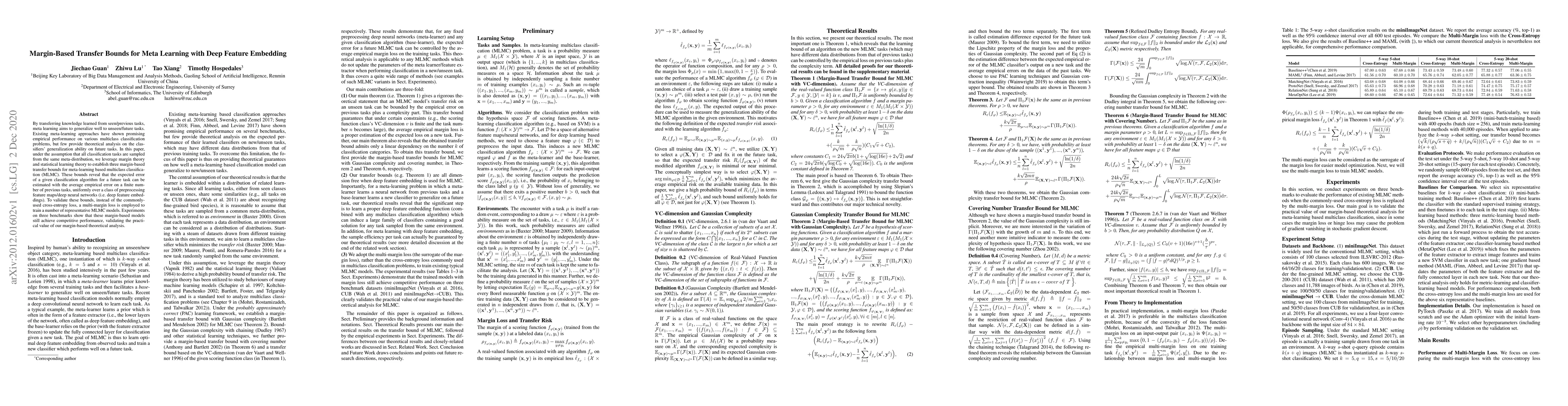 By transferring knowledge learned from seen/previous tasks, meta learning aims to generalize well to unseen/future tasks. Existing meta-learning approaches have shown promising empirical performance on various multiclass classification problems, but few provide theoretical analysis on the classifiers' generalization ability on future tasks. In this paper, under the assumption that all classification tasks are sampled from the same meta-distribution, we leverage margin theory and statistical learning theory to establish three margin-based transfer bounds for meta-learning based multiclass classification (MLMC). These bounds reveal that the expected error of a given classification algorithm for a future task can be estimated with the average empirical error on a finite number of previous tasks, uniformly over a class of preprocessing feature maps/deep neural networks (i.e. deep feature embeddings). To validate these bounds, instead of the commonly-used cross-entropy loss, a multi-margin loss is employed to train a number of representative MLMC models. Experiments on three benchmarks show that these margin-based models still achieve competitive performance, validating the practical value of our margin-based theoretical analysis.