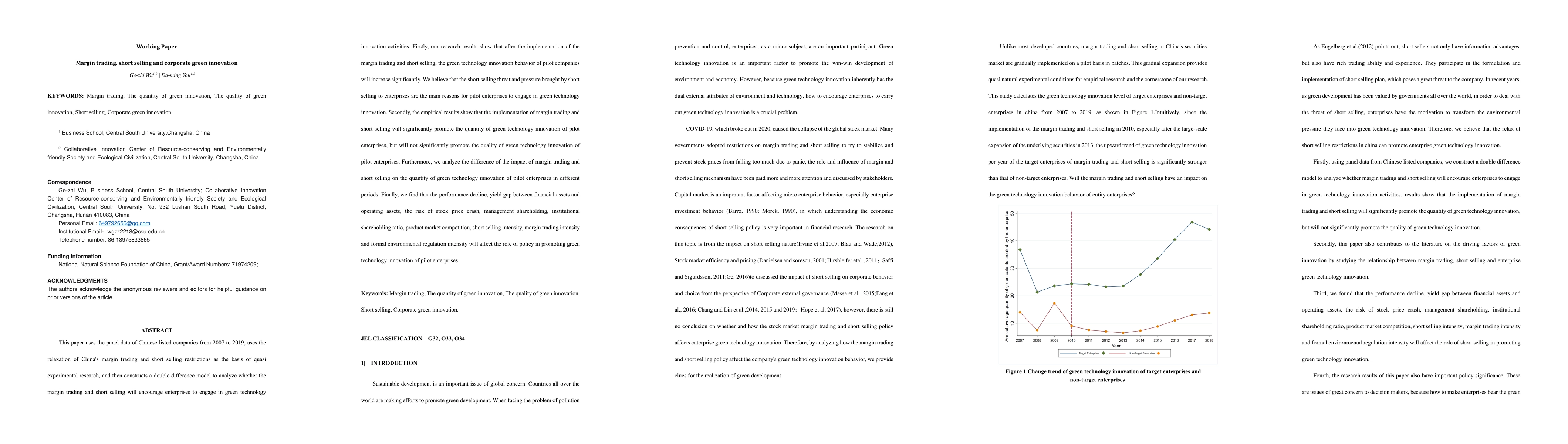 This paper uses the panel data of Chinese listed companies from 2007 to 2019, uses the relaxation of China's margin trading and short selling restrictions as the basis of quasi experimental research, and then constructs a double difference model to analyze whether the margin trading and short selling will encourage enterprises to engage in green technology innovation activities. Firstly, our research results show that after the implementation of the margin trading and short selling, the green technology innovation behavior of pilot companies will increase significantly. We believe that the short selling threat and pressure brought by short selling to enterprises are the main reasons for pilot enterprises to engage in green technology innovation. Secondly, the empirical results show that the implementation of margin trading and short selling will significantly promote the quantity of green technology innovation of pilot enterprises, but will not significantly promote the quality of green technology innovation of pilot enterprises. Furthermore, we analyze the difference of the impact of margin trading and short selling on the quantity of green technology innovation of pilot enterprises in different periods. Finally, we find that the performance decline, yield gap between financial assets and operating assets, the risk of stock price crash, management shareholding, institutional shareholding ratio, product market competition, short selling intensity, margin trading intensity and formal environmental regulation intensity will affect the role of policy in promoting green technology innovation of pilot enterprises.