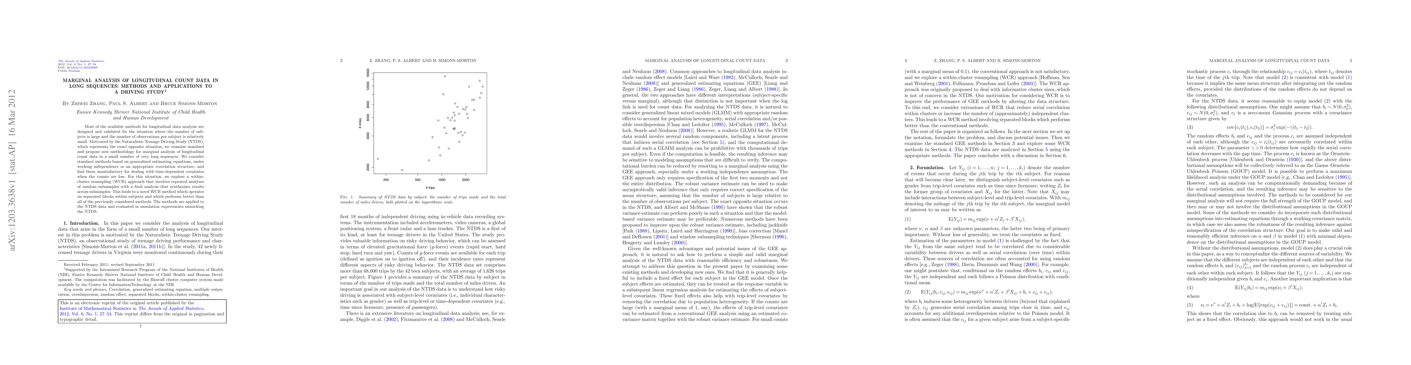Most of the available methods for longitudinal data analysis are designed and validated for the situation where the number of subjects is large and the number of observations per subject is relatively small. Motivated by the Naturalistic Teenage Driving Study (NTDS), which represents the exact opposite situation, we examine standard and propose new methodology for marginal analysis of longitudinal count data in a small number of very long sequences. We consider standard methods based on generalized estimating equations, under working independence or an appropriate correlation structure, and find them unsatisfactory for dealing with time-dependent covariates when the counts are low. For this situation, we explore a within-cluster resampling (WCR) approach that involves repeated analyses of random subsamples with a final analysis that synthesizes results across subsamples. This leads to a novel WCR method which operates on separated blocks within subjects and which performs better than all of the previously considered methods. The methods are applied to the NTDS data and evaluated in simulation experiments mimicking the NTDS.