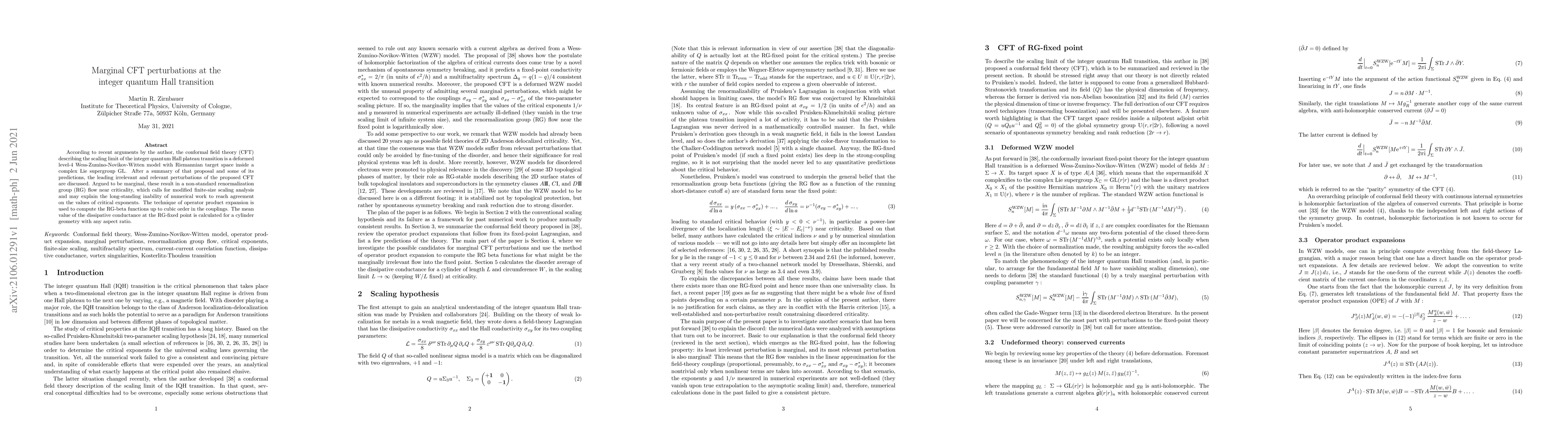 According to recent arguments by the author, the conformal field theory (CFT) describing the scaling limit of the integer quantum Hall plateau transition is a deformed level-4 Wess-Zumino-Novikov-Witten model with Riemannian target space inside a complex Lie supergroup GL. After a summary of that proposal and some of its predictions, the leading irrelevant and relevant perturbations of the proposed CFT are discussed. Argued to be marginal, these result in a non-standard renormalization group (RG) flow near criticality, which calls for modified finite-size scaling analysis and may explain the long-standing inability of numerical work to reach agreement on the values of critical exponents. The technique of operator product expansion is used to compute the RG-beta functions up to cubic order in the couplings. The mean value of the dissipative conductance at the RG-fixed point is calculated for a cylinder geometry with any aspect ratio.