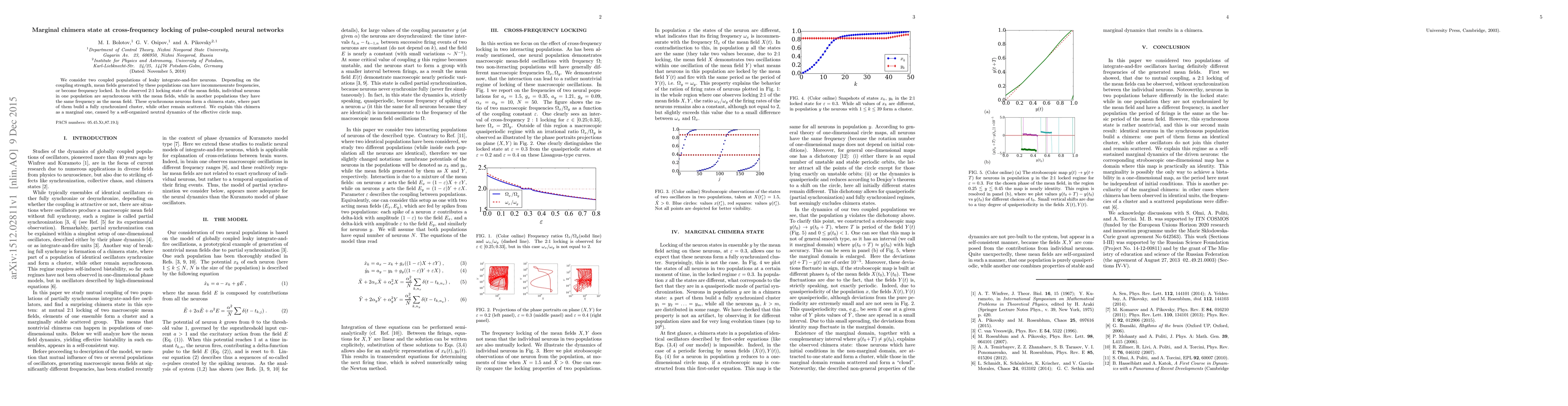 We consider two coupled populations of leaky integrate-and-fire neurons. Depending on the coupling strength, mean fields generated by these populations can have incommensurate frequencies, or become frequency locked. In the observed 2:1 locking state of the mean fields, individual neurons in one population are asynchronous with the mean fields, while in another populations they have the same frequency as the mean field. These synchronous neurons form a chimera state, where part of them build a fully synchronized cluster, while other remain scattered. We explain this chimera as a marginal one, caused by a self-organized neutral dynamics of the effective circle map.