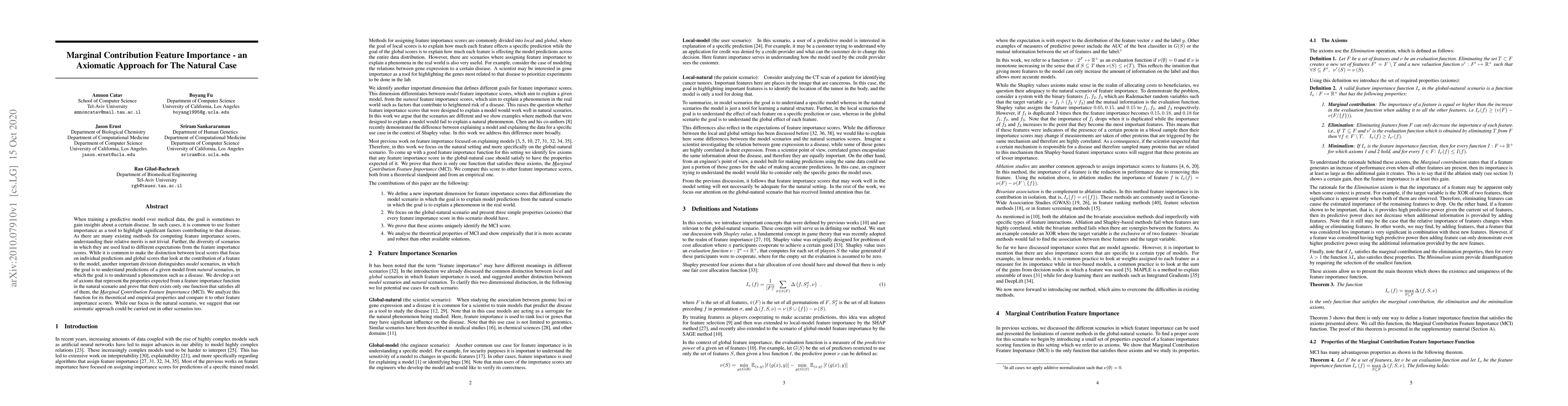 When training a predictive model over medical data, the goal is sometimes to gain insights about a certain disease. In such cases, it is common to use feature importance as a tool to highlight significant factors contributing to that disease. As there are many existing methods for computing feature importance scores, understanding their relative merits is not trivial. Further, the diversity of scenarios in which they are used lead to different expectations from the feature importance scores. While it is common to make the distinction between local scores that focus on individual predictions and global scores that look at the contribution of a feature to the model, another important division distinguishes model scenarios, in which the goal is to understand predictions of a given model from natural scenarios, in which the goal is to understand a phenomenon such as a disease. We develop a set of axioms that represent the properties expected from a feature importance function in the natural scenario and prove that there exists only one function that satisfies all of them, the Marginal Contribution Feature Importance (MCI). We analyze this function for its theoretical and empirical properties and compare it to other feature importance scores. While our focus is the natural scenario, we suggest that our axiomatic approach could be carried out in other scenarios too.