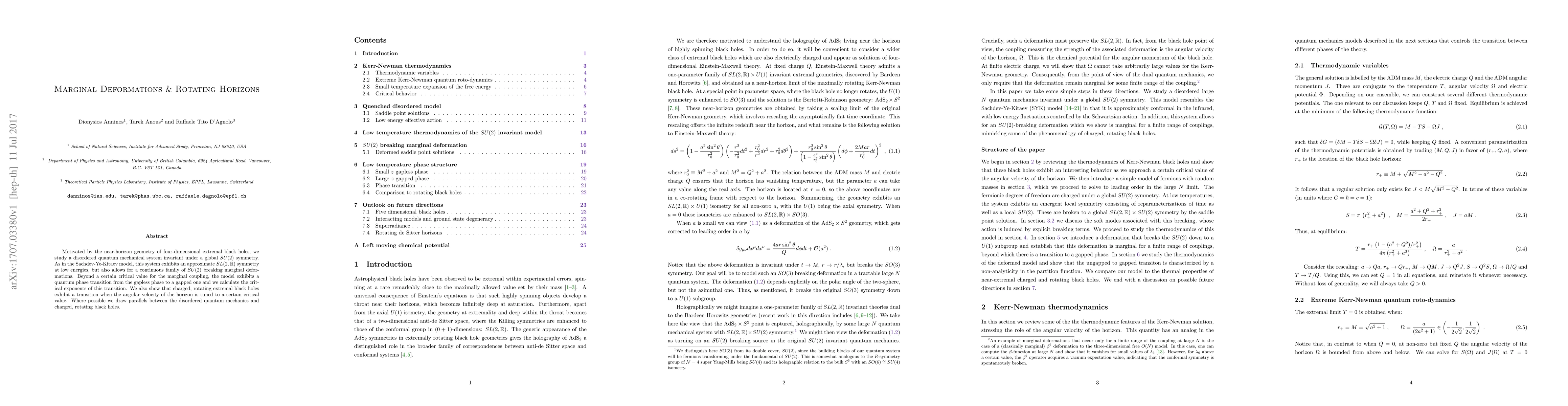 Motivated by the near-horizon geometry of four-dimensional extremal black holes, we study a disordered quantum mechanical system invariant under a global $SU(2)$ symmetry. As in the Sachdev-Ye-Kitaev model, this system exhibits an approximate $SL(2,\mathbb{R})$ symmetry at low energies, but also allows for a continuous family of $SU(2)$ breaking marginal deformations. Beyond a certain critical value for the marginal coupling, the model exhibits a quantum phase transition from the gapless phase to a gapped one and we calculate the critical exponents of this transition. We also show that charged, rotating extremal black holes exhibit a transition when the angular velocity of the horizon is tuned to a certain critical value. Where possible we draw parallels between the disordered quantum mechanics and charged, rotating black holes.