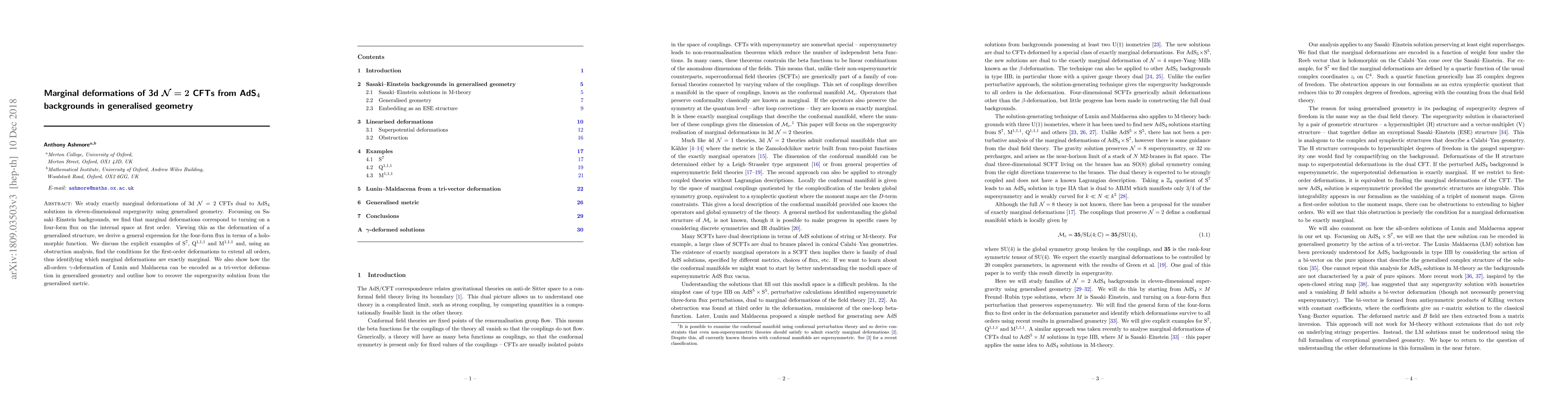 We study exactly marginal deformations of 3d $\mathcal{N}=2$ CFTs dual to AdS$_4$ solutions in eleven-dimensional supergravity using generalised geometry. Focussing on Sasaki-Einstein backgrounds, we find that marginal deformations correspond to turning on a four-form flux on the internal space at first order. Viewing this as the deformation of a generalised structure, we derive a general expression for the four-form flux in terms of a holomorphic function. We discuss the explicit examples of S$^7$, Q$^{1,1,1}$ and M$^{1,1,1}$ and, using an obstruction analysis, find the conditions for the first-order deformations to extend all orders, thus identifying which marginal deformations are exactly marginal. We also show how the all-orders $\gamma$-deformation of Lunin and Maldacena can be encoded as a tri-vector deformation in generalised geometry and outline how to recover the supergravity solution from the generalised metric.