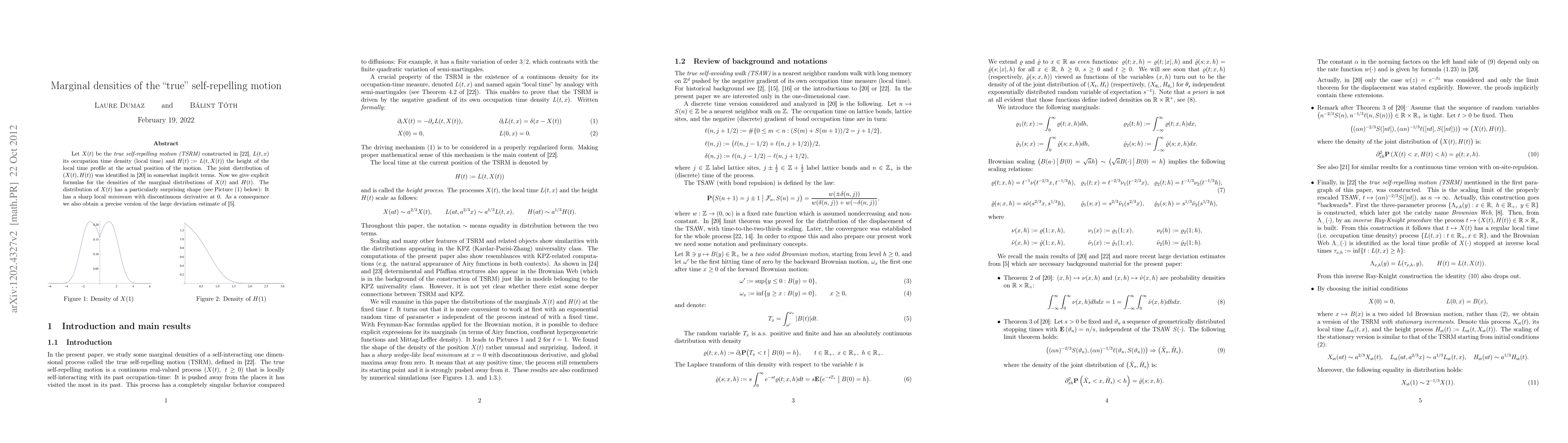 This paper provides explicit formulas for the marginal densities of the true self-repelling motion (TSRM), revealing a surprising sharp local minimum with a discontinuous derivative at 0 for the distribution of X(t). It also refines the large deviation estimate previously discussed in arXiv:1105.2948v3.