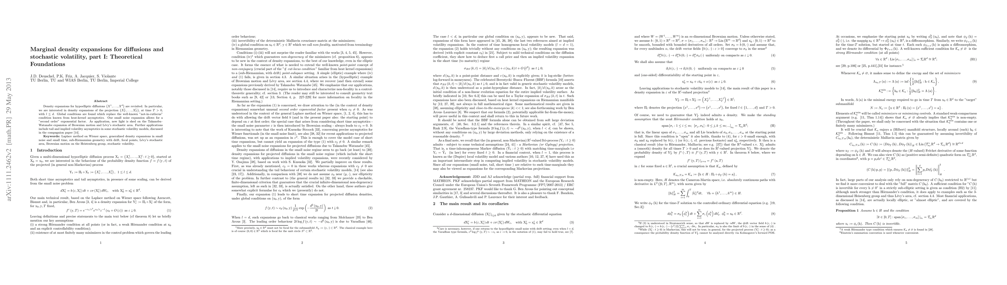 Density expansions for hypoelliptic diffusions $(X^1,...,X^d)$ are revisited. In particular, we are interested in density expansions of the projection $(X_T^1,...,X_T^l)$, at time $T>0$, with $l \leq d$. Global conditions are found which replace the well-known "not-in-cutlocus" condition known from heat-kernel asymptotics. Our small noise expansion allows for a "second order" exponential factor. As application, new light is shed on the Takanobu--Watanabe expansion of Brownian motion and Levy's stochastic area. Further applications include tail and implied volatility asymptotics in some stochastic volatility models, discussed in a compagnion paper.