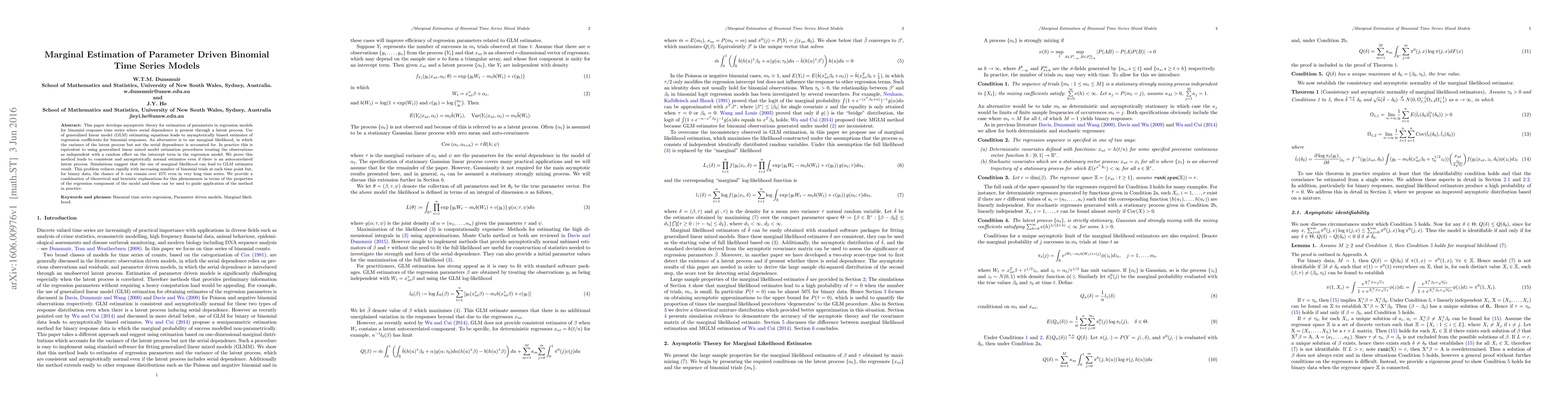 This paper develops asymptotic theory for estimation of parameters in regression models for binomial response time series where serial dependence is present through a latent process. Use of generalized linear model (GLM) estimating equations leads to asymptotically biased estimates of regression coefficients for binomial responses. An alternative is to use marginal likelihood, in which the variance of the latent process but not the serial dependence is accounted for. In practice this is equivalent to using generalized linear mixed model estimation procedures treating the observations as independent with a random effect on the intercept term in the regression model. We prove this method leads to consistent and asymptotically normal estimates even if there is an autocorrelated latent process. Simulations suggest that the use of marginal likelihood can lead to GLM estimates result. This problem reduces rapidly with increasing number of binomial trials at each time point but, for binary data, the chance of it can remain over 45% even in very long time series. We provide a combination of theoretical and heuristic explanations for this phenomenon in terms of the properties of the regression component of the model and these can be used to guide application of the method in practice.