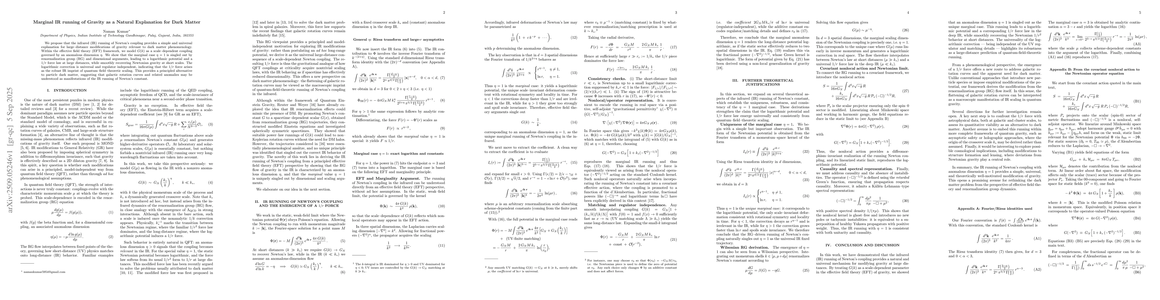 We propose that the infrared (IR) running of Newton's coupling provides a simple and universal explanation for large--distance modifications of gravity relevant to dark matter phenomenology. Within the effective field theory (EFT) framework, we model $G(k)$ as a scale--dependent coupling governed by an anomalous dimension $\eta$. We show that the marginal case $\eta = 1$ is singled out by renormalization group (RG) and dimensional arguments, leading to a logarithmic potential and a $1/r$ force law at large distances, while smoothly recovering Newtonian gravity at short scales. The logarithmic correction is universal and regulator independent, indicating that the $1/r$ force arises as the robust IR imprint of quantum--field--theoretic scaling. This provides a principled alternative to particle dark matter, suggesting that galactic rotation curves and related anomalies may be understood as manifestations of the IR running of Newton's constant.