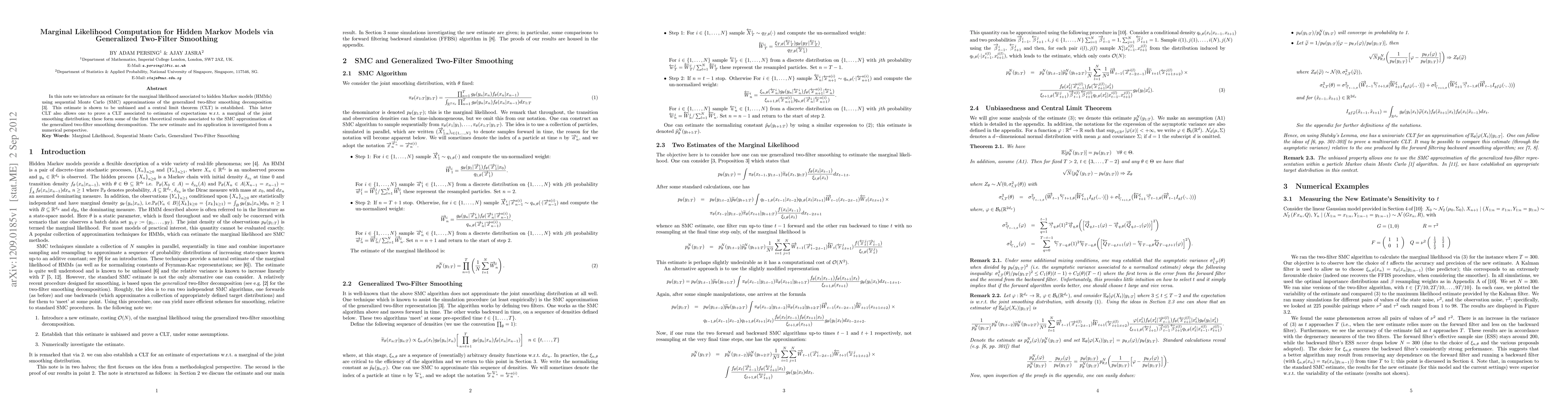 In this note we introduce an estimate for the marginal likelihood associated to hidden Markov models (HMMs) using sequential Monte Carlo (SMC) approximations of the generalized two-filter smoothing decomposition (Briers, 2010). This estimate is shown to be unbiased and a central limit theorem (CLT) is established. This latter CLT also allows one to prove a CLT associated to estimates of expectations w.r.t. a marginal of the joint smoothing distribution; these form some of the first theoretical results associated to the SMC approximation of the generalized two-filter smoothing decomposition. The new estimate and its application is investigated from a numerical perspective.
