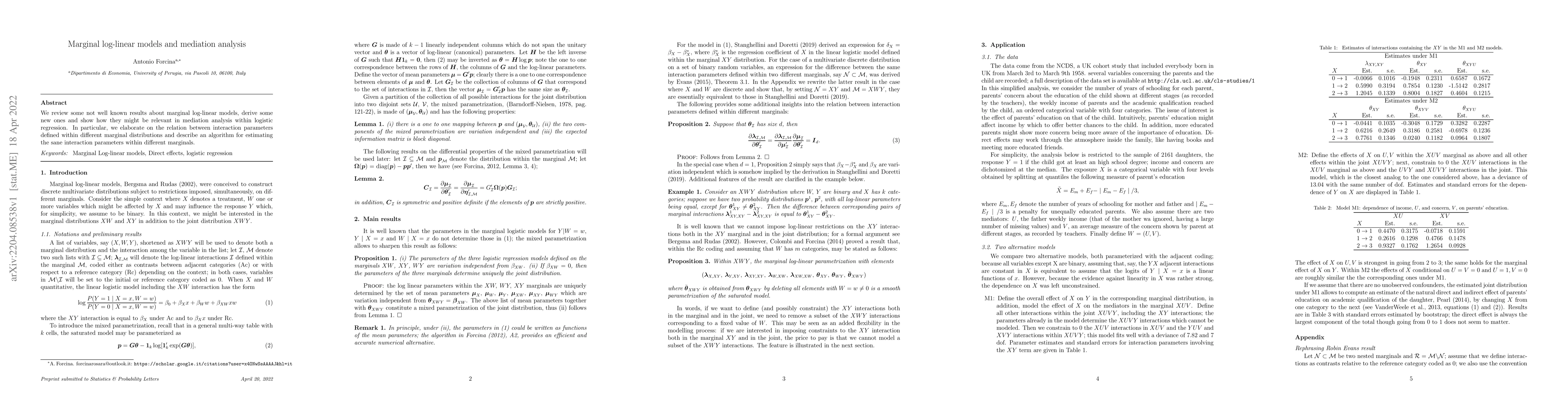 This paper reviews marginal log-linear models, derives new results, and shows their relevance in mediation analysis within logistic regression. It also introduces an algorithm for estimating interaction parameters across different marginal distributions.