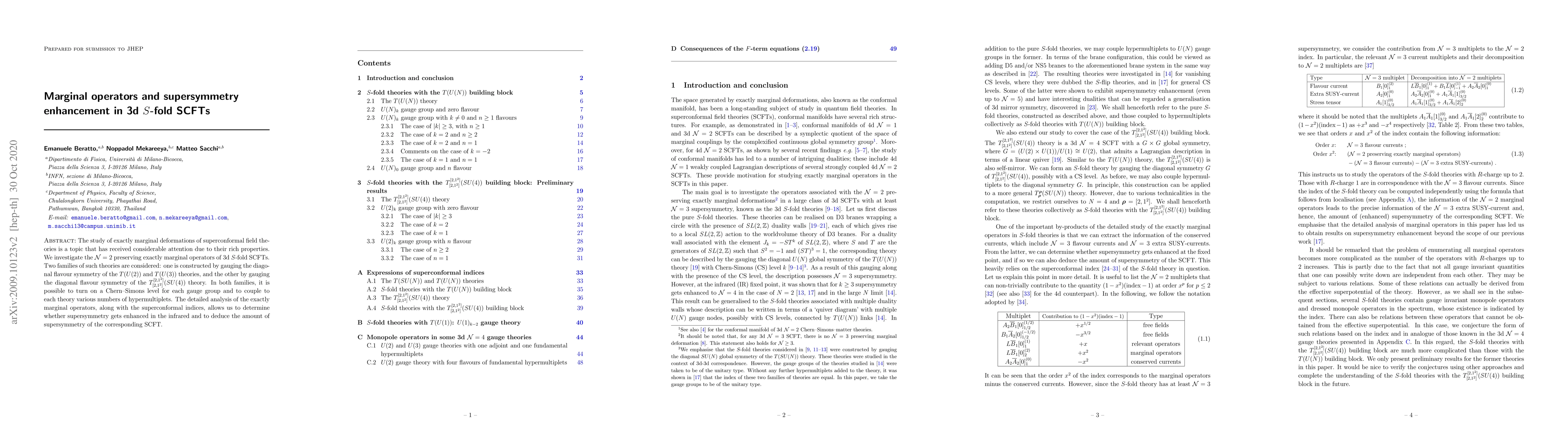 The study of exactly marginal deformations of superconformal field theories is a topic that has received considerable attention due to their rich properties. We investigate the $\mathcal{N}=2$ preserving exactly marginal operators of 3d $S$-fold SCFTs. Two families of such theories are considered: one is constructed by gauging the diagonal flavour symmetry of the $T(U(2))$ and $T(U(3))$ theories, and the other by gauging the diagonal flavour symmetry of the $T^{[2,1^2]}_{[2,1^2]}(SU(4))$ theory. In both families, it is possible to turn on a Chern--Simons level for each gauge group and to couple to each theory various numbers of hypermultiplets. The detailed analysis of the exactly marginal operators, along with the superconformal indices, allows us to determine whether supersymmetry gets enhanced in the infrared and to deduce the amount of supersymmetry of the corresponding SCFT.