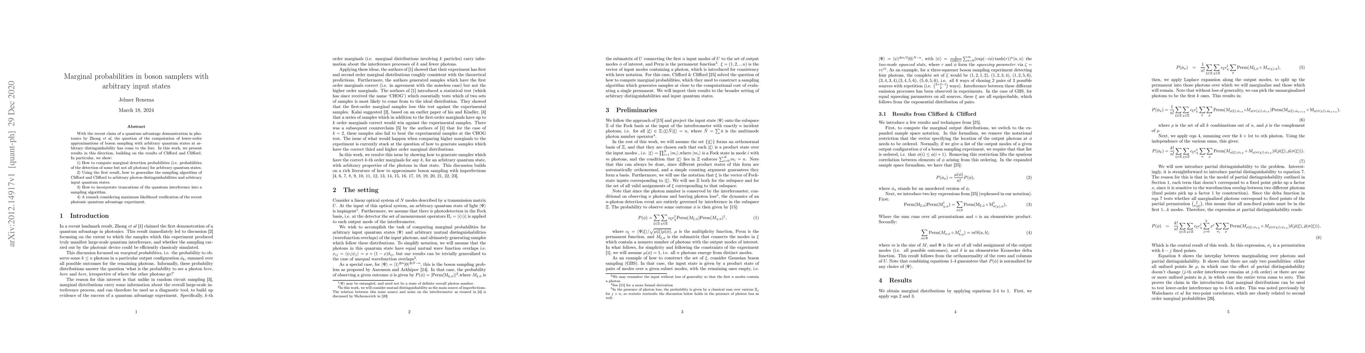 With the recent claim of a quantum advantage demonstration in photonics by Zhong et al, the question of the computation of lower-order approximations of boson sampling with arbitrary quantum states at arbitrary distinguishability has come to the fore. In this work, we present results in this direction, building on the results of Clifford and Clifford. In particular, we show: 1) How to compute marginal detection probabilities (i.e. probabilities of the detection of some but not all photons) for arbitrary quantum states. 2) Using the first result, how to generalize the sampling algorithm of Clifford and Clifford to arbitrary photon distinguishabilities and arbitrary input quantum states. 3) How to incorporate truncations of the quantum interference into a sampling algorithm. 4) A remark considering maximum likelihood verification of the recent photonic quantum advantage experiment.
