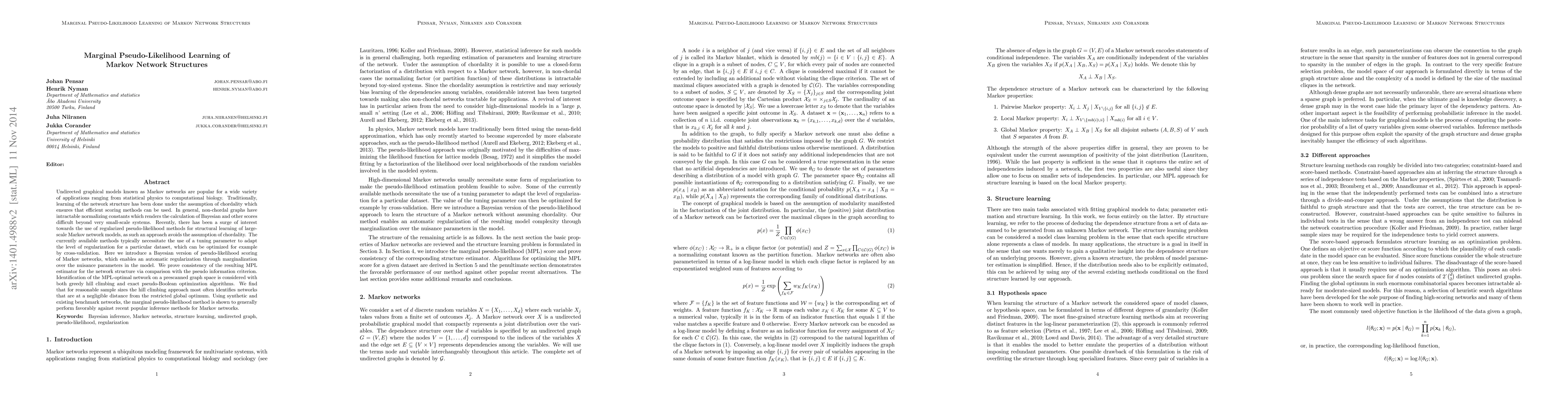 This paper introduces a Bayesian version of marginal pseudo-likelihood learning for Markov network structures, which automatically adjusts regularization through marginalization over nuisance parameters. The method is shown to perform favorably against other inference methods, especially for non-chordal graphs, and is effective even with greedy hill climbing for network identification.