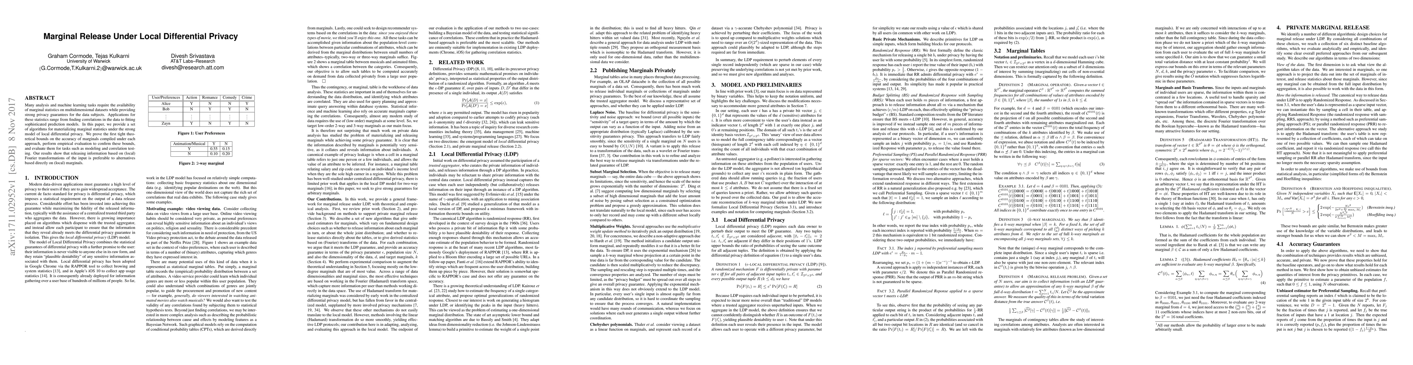This paper presents algorithms for generating marginal statistics under local differential privacy, proving tight theoretical bounds and confirming their accuracy through empirical evaluation. It finds that using Fourier transformations for data release is more effective than direct marginal-based approaches for tasks like modeling and correlation testing.