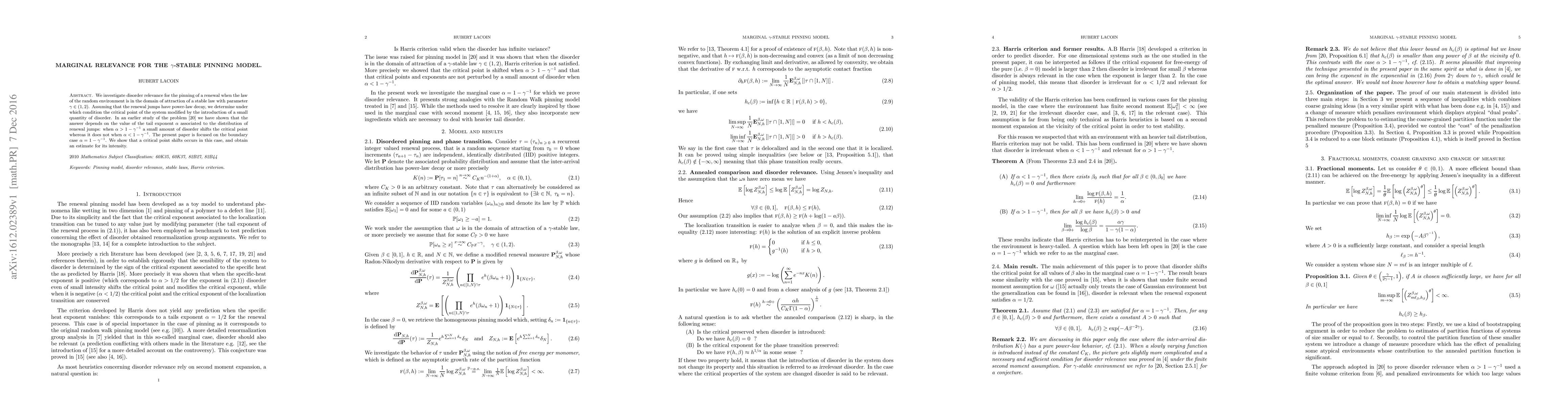 This paper examines the marginal relevance of disorder in the $\gamma$-stable pinning model when the tail exponent $\alpha$ equals $1-\gamma^{-1}$. It finds that even a small amount of disorder shifts the critical point, providing an estimate for the intensity of this shift.