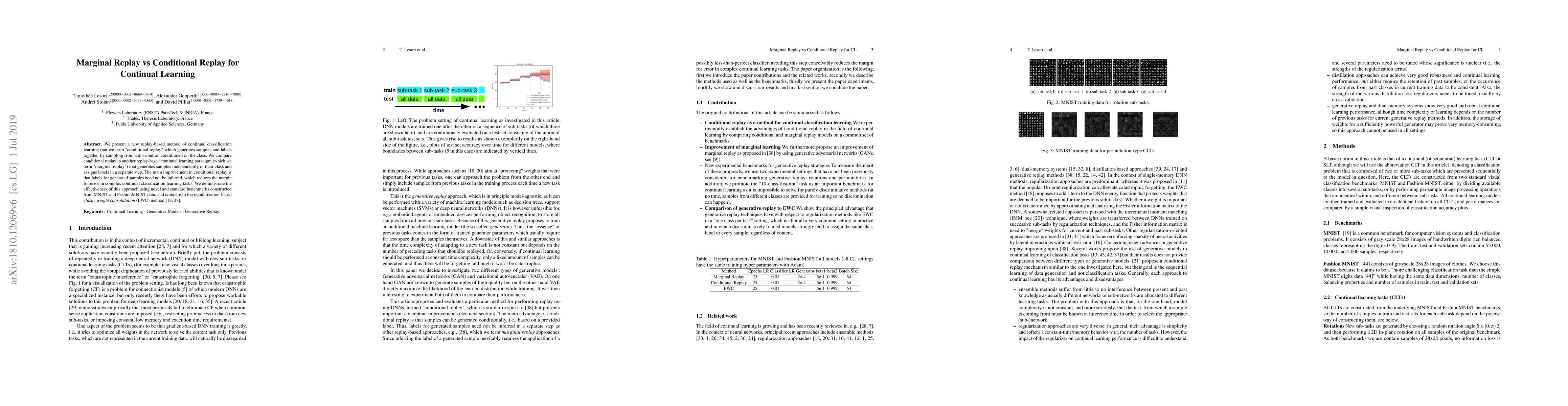 Title: Marginal Replay vs Conditional Replay for Continual Learning Summary: This paper introduces "conditional replay," a novel method for continual classification learning that generates samples and labels together by sampling from a distribution conditioned on the class, improving upon "marginal replay" by reducing errors. The effectiveness is demonstrated on MNIST and FashionMNIST benchmarks, outperforming the elastic weight consolidation method.