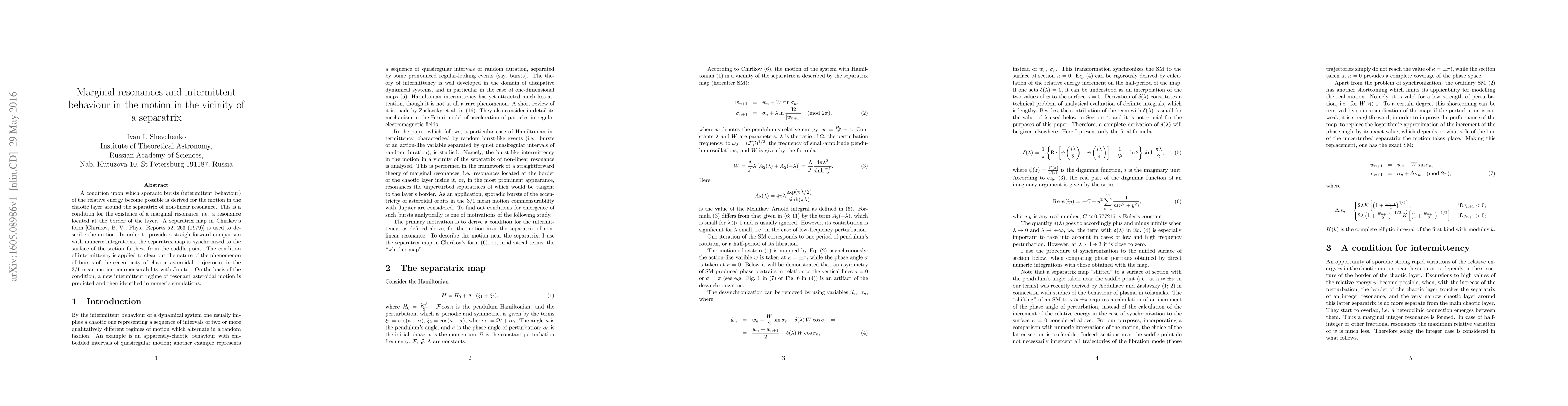A condition upon which sporadic bursts (intermittent behaviour) of the relative energy become possible is derived for the motion in the chaotic layer around the separatrix of non-linear resonance. This is a condition for the existence of a marginal resonance, i.e. a resonance located at the border of the layer. A separatrix map in Chirikov's form [Chirikov, B. V., Phys. Reports 52, 263 (1979)] is used to describe the motion. In order to provide a straightforward comparison with numeric integrations, the separatrix map is synchronized to the surface of the section farthest from the saddle point. The condition of intermittency is applied to clear out the nature of the phenomenon of bursts of the eccentricity of chaotic asteroidal trajectories in the 3/1 mean motion commensurability with Jupiter. On the basis of the condition, a new intermittent regime of resonant asteroidal motion is predicted and then identified in numeric simulations.