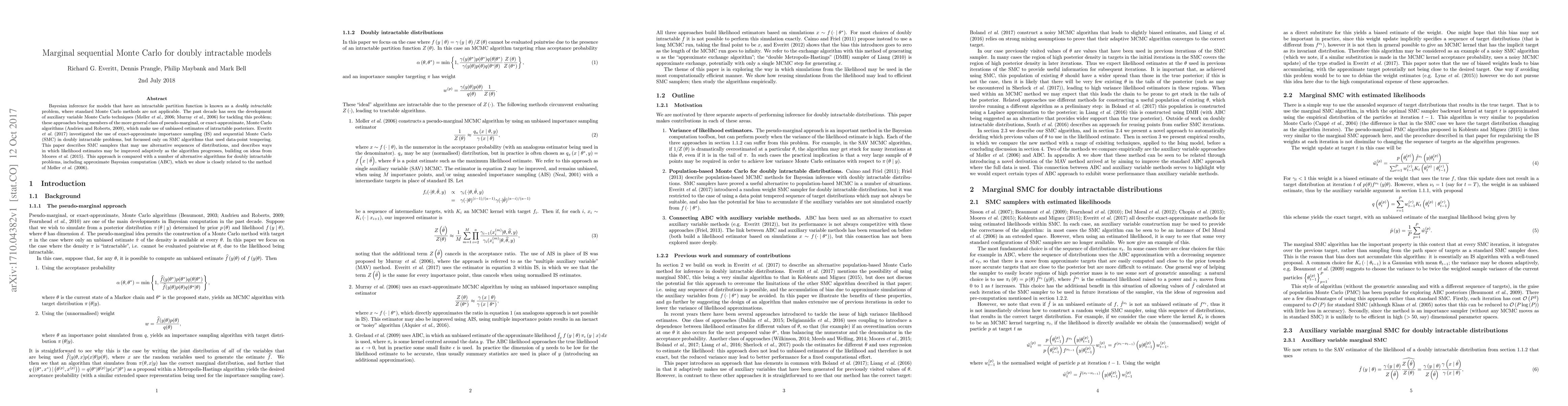 This paper proposes a marginal sequential Monte Carlo (SMC) method for Bayesian inference in doubly intractable models, improving likelihood estimates adaptively and comparing it with alternative algorithms like approximate Bayesian computation (ABC). The method builds on exact-approximate Monte Carlo techniques and extends previous work on SMC with data-point tempering.