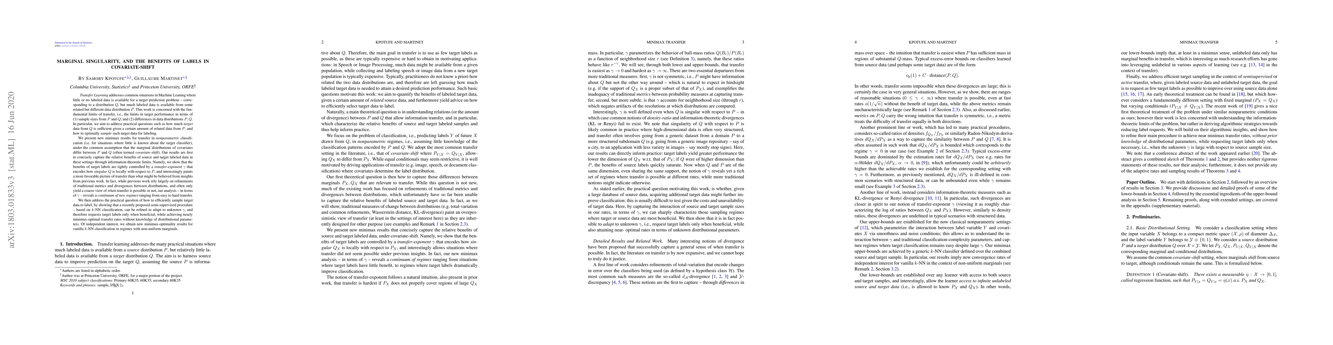 We present new minimax results that concisely capture the relative benefits of source and target labeled data, under covariate-shift. Namely, we show that the benefits of target labels are controlled by a transfer-exponent $\gamma$ that encodes how singular Q is locally w.r.t. P, and interestingly allows situations where transfer did not seem possible under previous insights. In fact, our new minimax analysis - in terms of $\gamma$ - reveals a continuum of regimes ranging from situations where target labels have little benefit, to regimes where target labels dramatically improve classification. We then show that a recently proposed semi-supervised procedure can be extended to adapt to unknown $\gamma$, and therefore requests labels only when beneficial, while achieving minimax transfer rates.