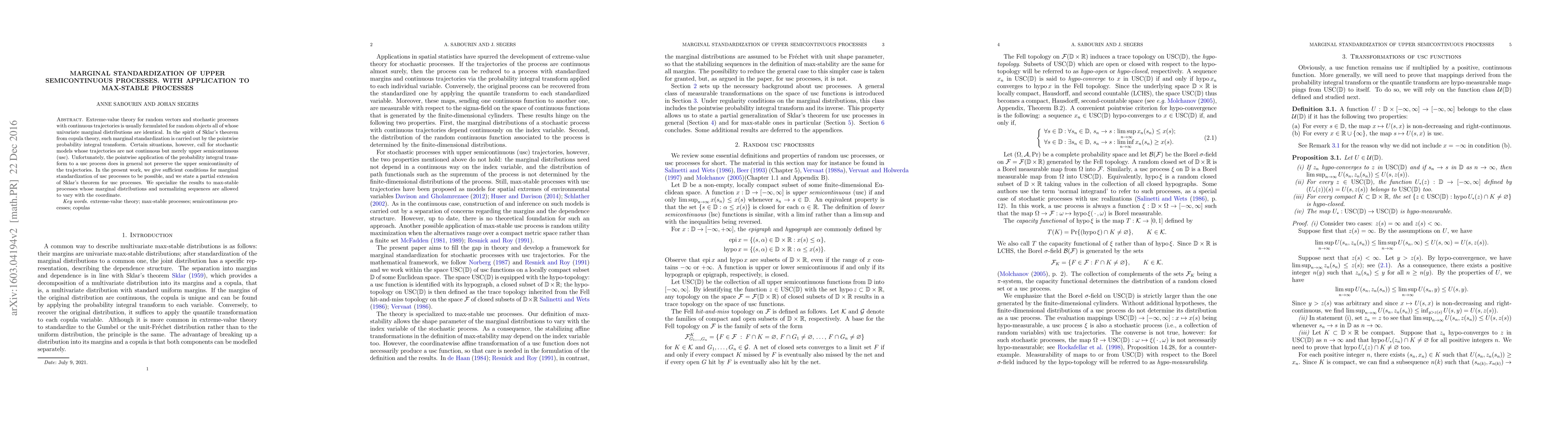 Extreme-value theory for random vectors and stochastic processes with continuous trajectories is usually formulated for random objects all of whose univariate marginal distributions are identical. In the spirit of Sklar's theorem from copula theory, such marginal standardization is carried out by the pointwise probability integral transform. Certain situations, however, call for stochastic models whose trajectories are not continuous but merely upper semicontinuous (usc). Unfortunately, the pointwise application of the probability integral transform to a usc process does in general not preserve the upper semicontinuity of the trajectories. In the present work, we give sufficient conditions for marginal standardization of usc processes to be possible, and we state a partial extension of Sklar's theorem for usc processes. We specialize the results to max-stable processes whose marginal distributions and normalizing sequences are allowed to vary with the coordinate.