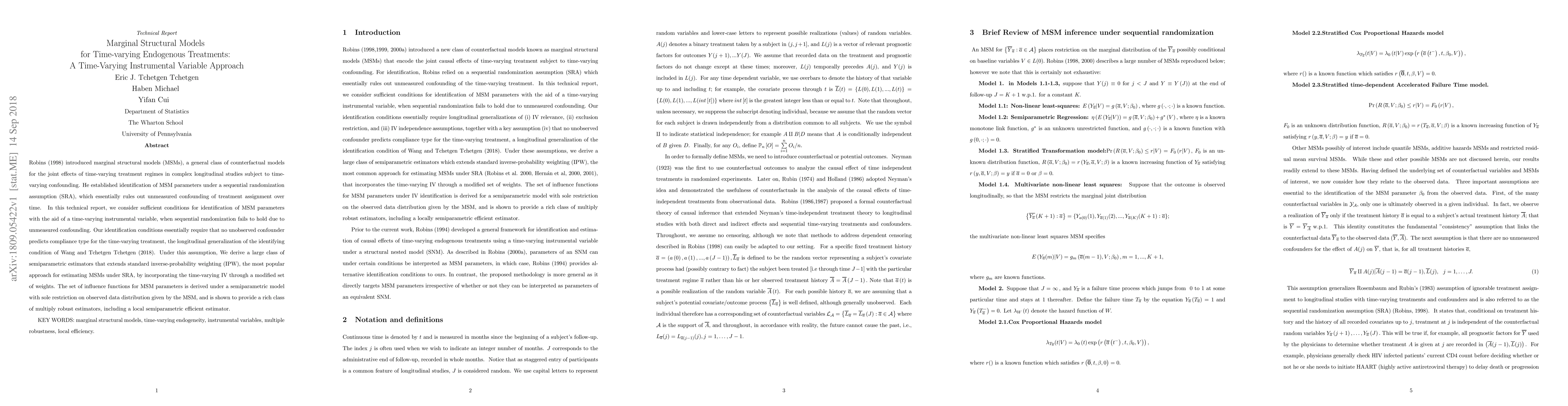Robins (1998) introduced marginal structural models (MSMs), a general class of counterfactual models for the joint effects of time-varying treatment regimes in complex longitudinal studies subject to time-varying confounding. He established identification of MSM parameters under a sequential randomization assumption (SRA), which essentially rules out unmeasured confounding of treatment assignment over time. In this technical report, we consider sufficient conditions for identification of MSM parameters with the aid of a time-varying instrumental variable, when sequential randomization fails to hold due to unmeasured confounding. Our identification conditions essentially require that no unobserved confounder predicts compliance type for the time-varying treatment, the longitudinal generalization of the identifying condition of Wang and Tchetgen Tchetgen (2018). Under this assumption, We derive a large class of semiparametric estimators that extends standard inverse-probability weighting (IPW), the most popular approach for estimating MSMs under SRA, by incorporating the time-varying IV through a modified set of weights. The set of influence functions for MSM parameters is derived under a semiparametric model with sole restriction on observed data distribution given by the MSM, and is shown to provide a rich class of multiply robust estimators, including a local semiparametric efficient estimator.