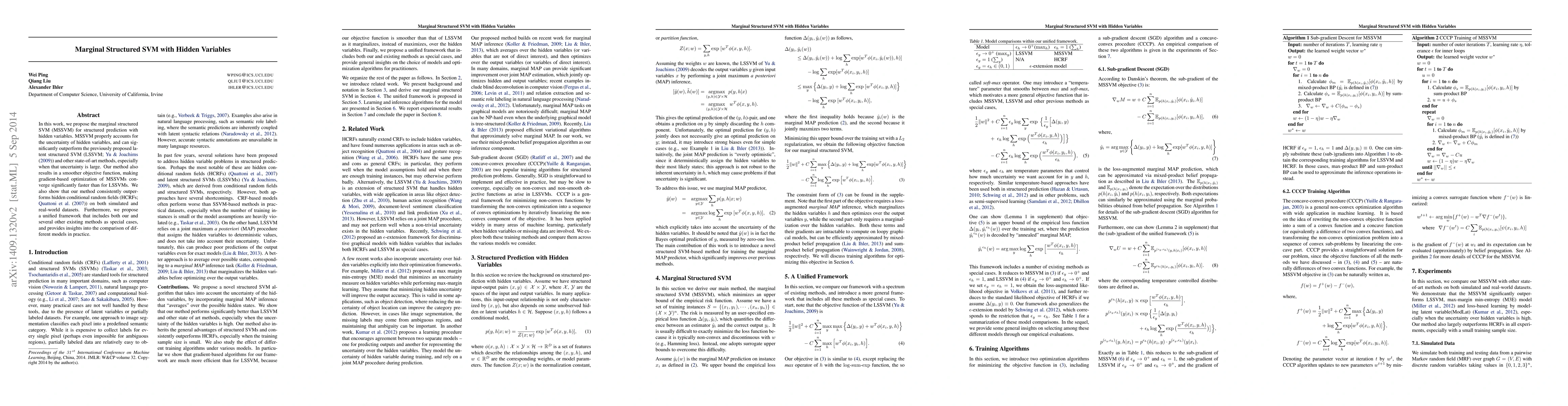 Researchers propose a new method called marginal structured SVM with hidden variables, which can better handle uncertainty in hidden variables and outperform existing methods on various datasets. The approach also leads to faster convergence for gradient-based optimization.