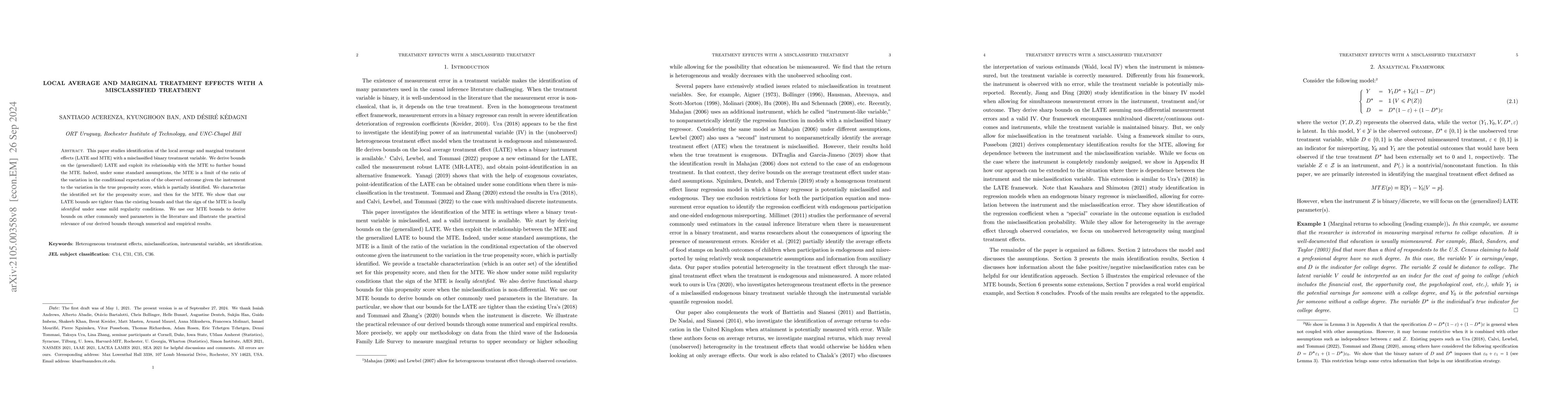 This paper identifies the marginal treatment effect (MTE) under misclassified treatment, showing that it is the derivative of the conditional expectation based on the true propensity score. It characterizes the identified set for both the propensity score and the MTE, demonstrating tighter bounds on the local average treatment effect compared to existing methods.