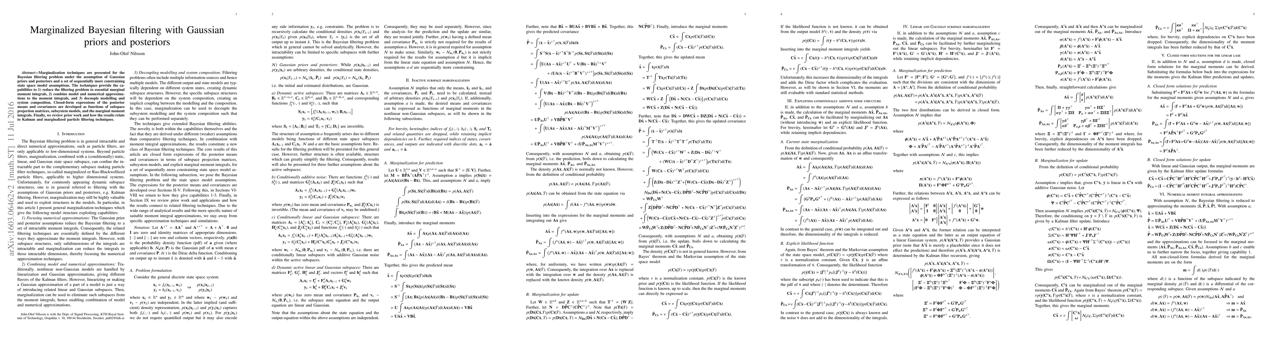 This paper develops marginalization techniques for Bayesian filtering with Gaussian priors and posteriors, enabling reduction to essential marginal moment integrals, combining model and numerical approximations, and decoupling modeling from system composition. It provides closed-form expressions for posterior means and covariances and relates the results to Kalman and marginalized particle filtering.