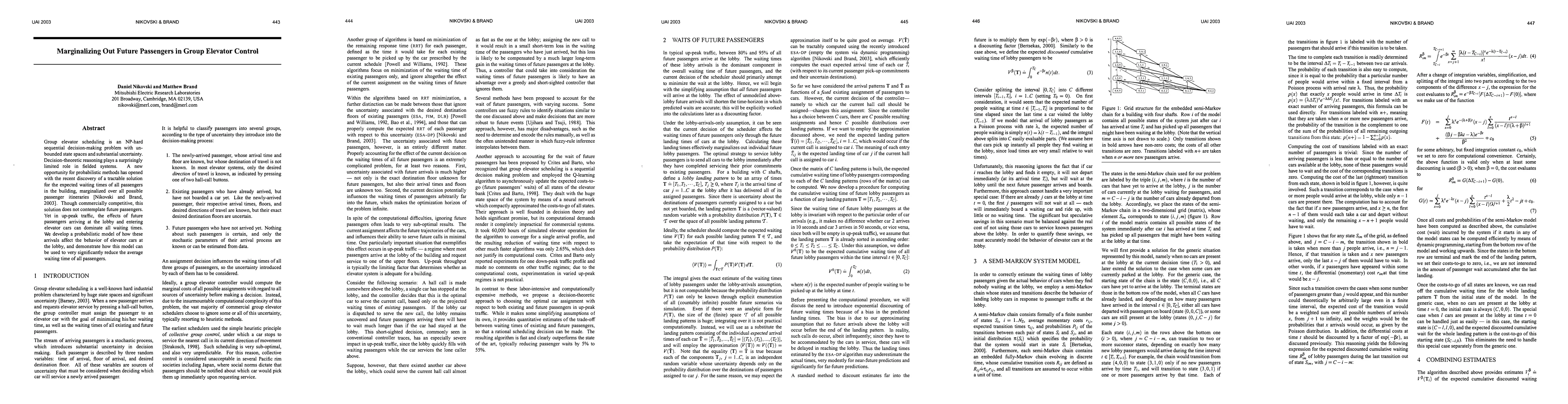 Group elevator scheduling is an NP-hard sequential decision-making problem with unbounded state spaces and substantial uncertainty. Decision-theoretic reasoning plays a surprisingly limited role in fielded systems. A new opportunity for probabilistic methods has opened with the recent discovery of a tractable solution for the expected waiting times of all passengers in the building, marginalized over all possible passenger itineraries. Though commercially competitive, this solution does not contemplate future passengers. Yet in up-peak traffic, the effects of future passengers arriving at the lobby and entering elevator cars can dominate all waiting times. We develop a probabilistic model of how these arrivals affect the behavior of elevator cars at the lobby, and demonstrate how this model can be used to very significantly reduce the average waiting time of all passengers.