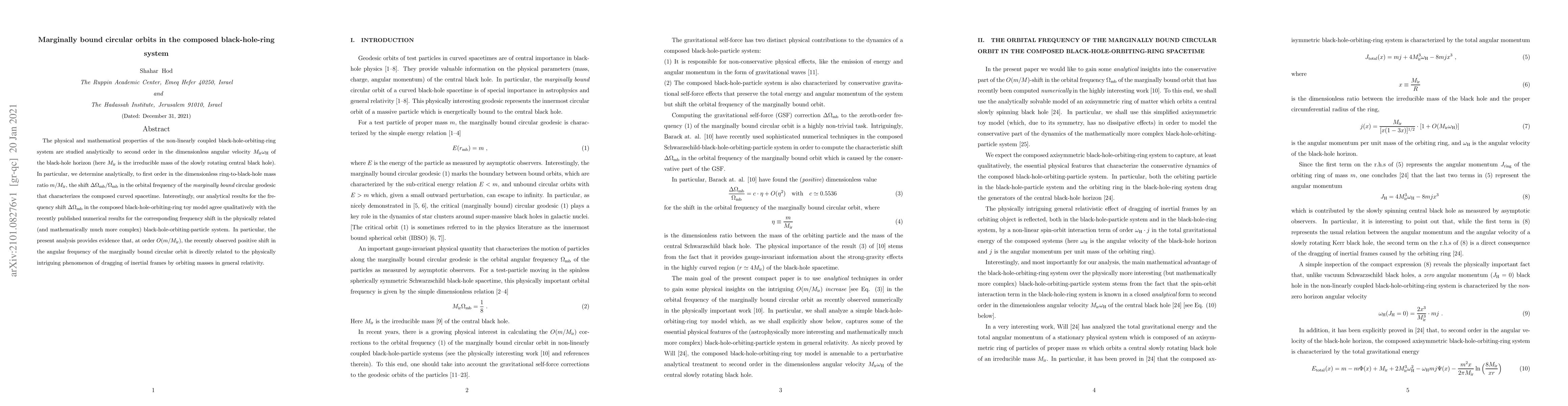 The physical and mathematical properties of the non-linearly coupled black-hole-orbiting-ring system are studied analytically to second order in the dimensionless angular velocity $M_{\text{ir}}\omega_{\text{H}}$ of the black-hole horizon (here $M_{\text{ir}}$ is the irreducible mass of the slowly rotating central black hole). In particular, we determine analytically, to first order in the dimensionless ring-to-black-hole mass ratio $m/M_{\text{ir}}$, the shift $\Delta\Omega_{\text{mb}}/\Omega_{\text{mb}}$ in the orbital frequency of the {\it marginally bound} circular geodesic that characterizes the composed curved spacetime. Interestingly, our analytical results for the frequency shift $\Delta\Omega_{\text{mb}}$ in the composed black-hole-orbiting-ring toy model agree qualitatively with the recently published numerical results for the corresponding frequency shift in the physically related (and mathematically much more complex) black-hole-orbiting-particle system. In particular, the present analysis provides evidence that, at order $O(m/M_{\text{ir}})$, the recently observed positive shift in the angular frequency of the marginally bound circular orbit is directly related to the physically intriguing phenomenon of dragging of inertial frames by orbiting masses in general relativity.