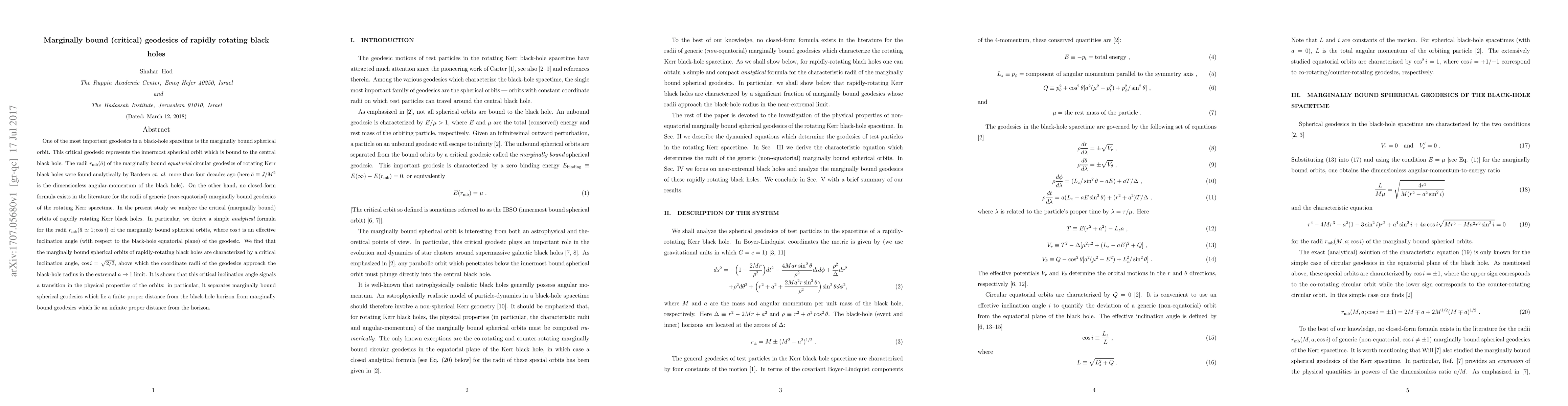 One of the most important geodesics in a black-hole spacetime is the marginally bound spherical orbit. This critical geodesic represents the innermost spherical orbit which is bound to the central black hole. The radii $r_{\text{mb}}({\bar a})$ of the marginally bound {\it equatorial} circular geodesics of rotating Kerr black holes were found analytically by Bardeen {\it et. al.} more than four decades ago (here $\bar a\equiv J/M^2$ is the dimensionless angular-momentum of the black hole). On the other hand, no closed-form formula exists in the literature for the radii of generic ({\it non}-equatorial) marginally bound geodesics of the rotating Kerr spacetime. In the present study we analyze the critical (marginally bound) orbits of rapidly rotating Kerr black holes. In particular, we derive a simple {\it analytical} formula for the radii $r_{\text{mb}}(\bar a\simeq 1;\cos i)$ of the marginally bound spherical orbits, where $\cos i$ is an effective inclination angle (with respect to the black-hole equatorial plane) of the geodesic. We find that the marginally bound spherical orbits of rapidly-rotating black holes are characterized by a critical inclination angle, $\cos i=\sqrt{{2/3}}$, above which the coordinate radii of the geodesics approach the black-hole radius in the extremal $\bar a\to1$ limit. It is shown that this critical inclination angle signals a transition in the physical properties of the orbits: in particular, it separates marginally bound spherical geodesics which lie a finite proper distance from the black-hole horizon from marginally bound geodesics which lie an infinite proper distance from the horizon.